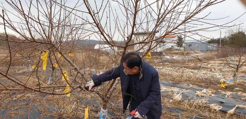 연천 복숭아 전지 작업 실시. 날씨가 영상 3도에 바람도 안불어서 일하기 좋았음. 밭에 물이 덜 빠진것 같아서 고랑을 파야할 것 같음