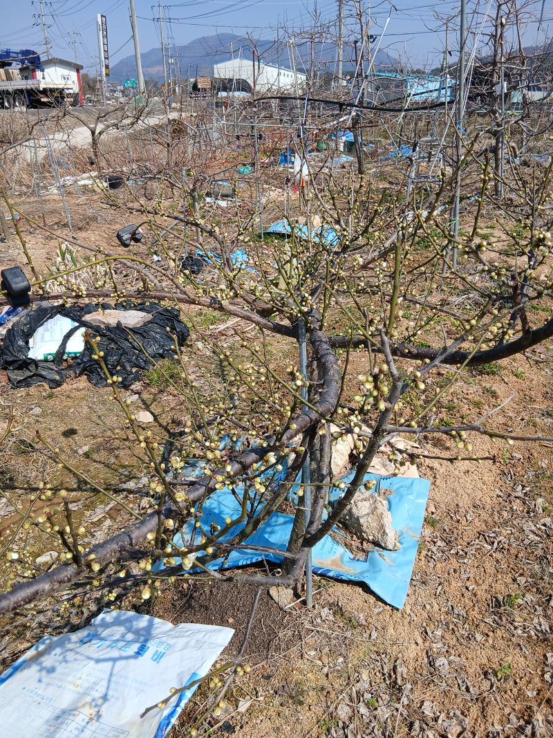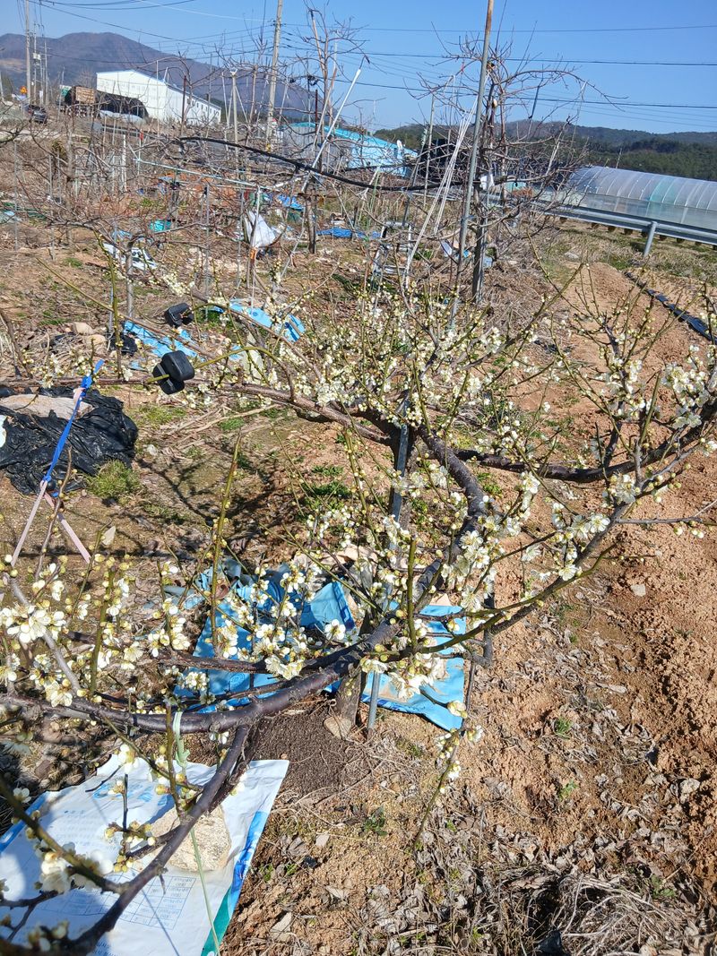 농협에서 고구마 전용비료 1포와 원예용밑거름 1포를 사가지고 농장에가서 양배추2개 채취 자두 전지 정리하고 봄동 완전 수확하고 블루베리 화분에 물을주었다 매실 꽃이 완전히 피었다