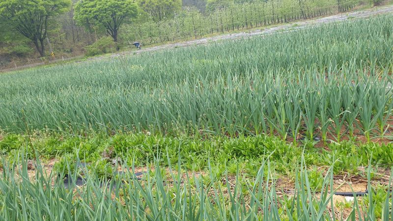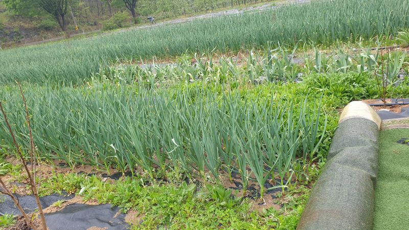 홍산마늘 재배했는데 이리 많이 컸네요. 저초제 사용을 않한터라 중간에 풀은 뽑아줬는데 가에는 이리 풀이 많네요