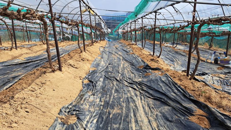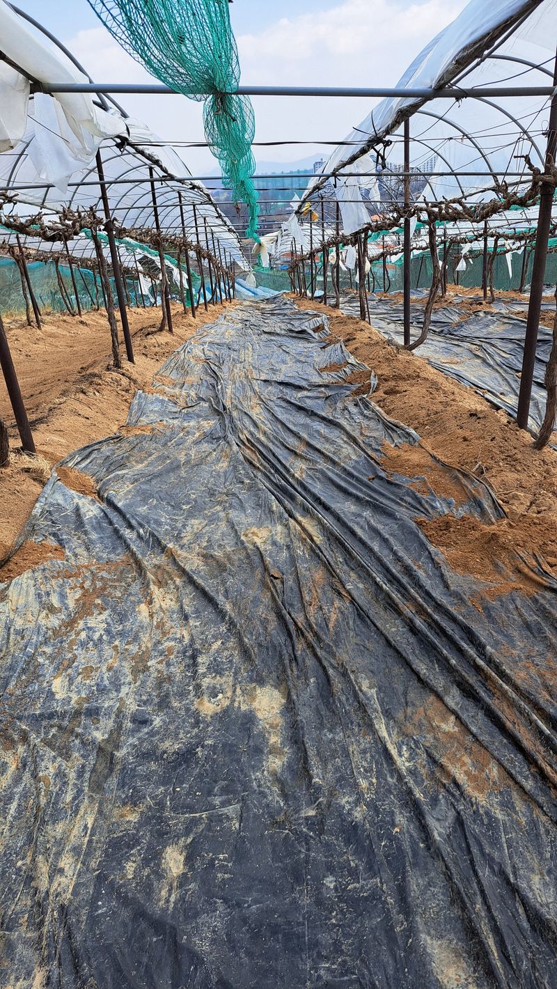 포도밭 포도나무 평탄하게 억제비닐작업함
