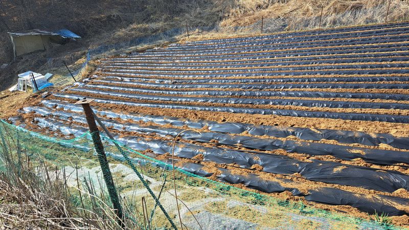 포도밭 관수시설배관연결작업및동부콩심을데 피복을 작업을 하였습니다 오늘