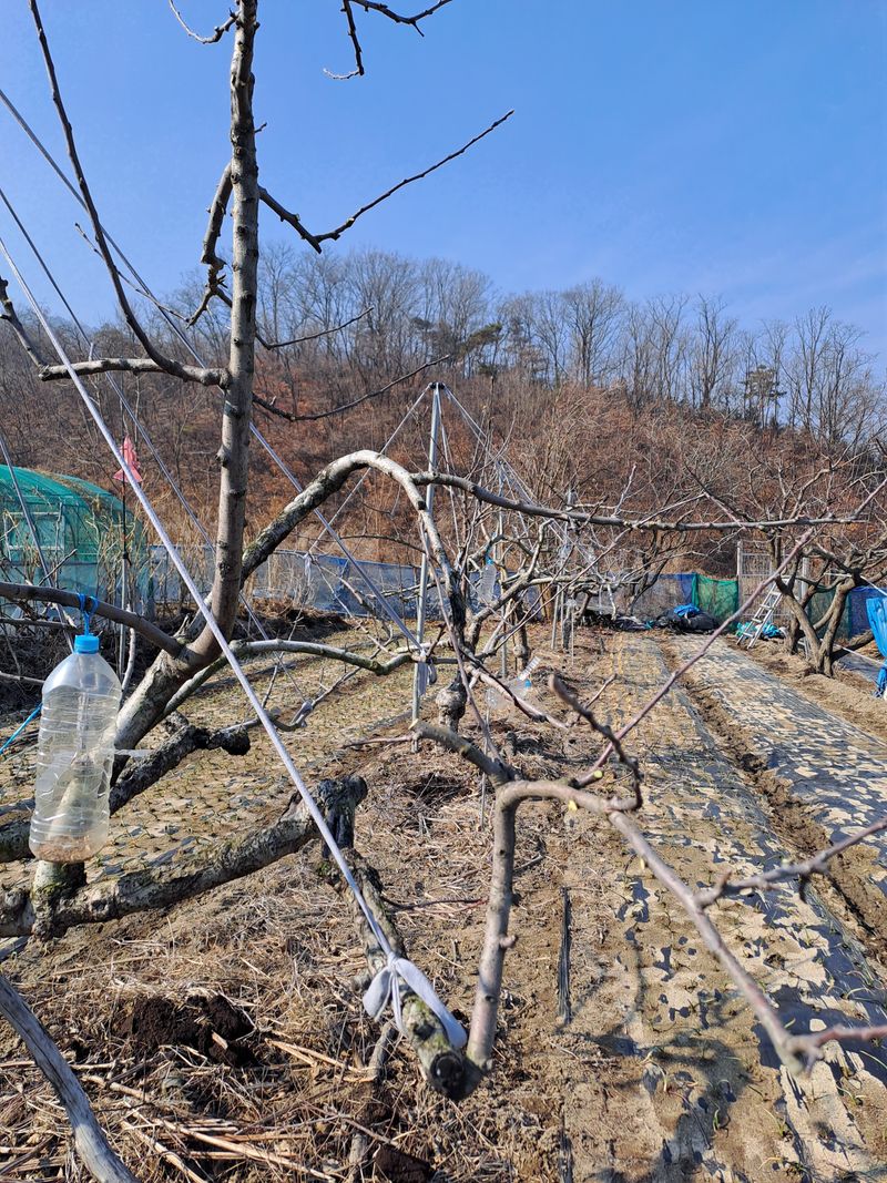 사과나무산까치피해방지생수병에크레졸비누액희서해서나무에달아줌사과나무옆모형독수리달아놓았음