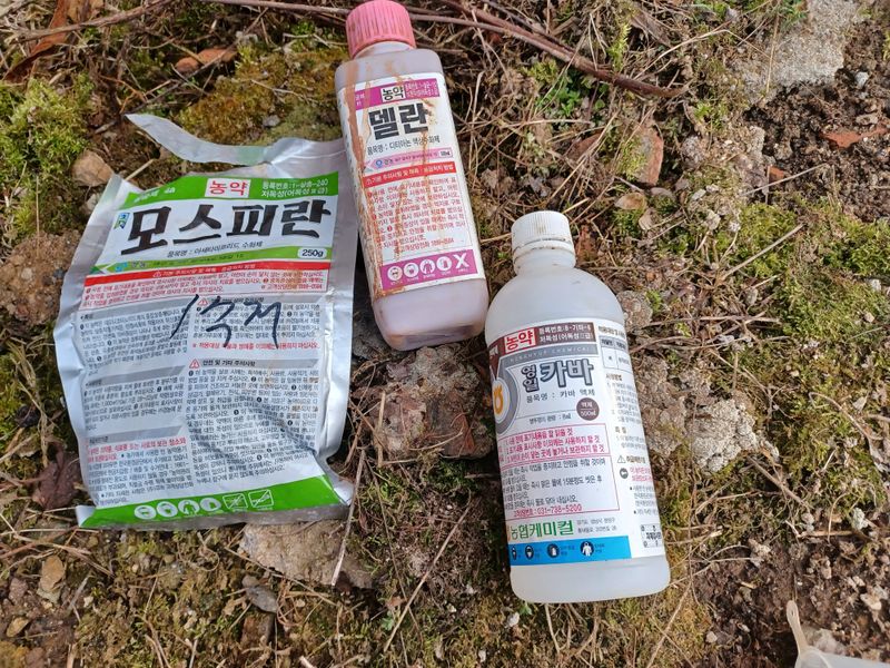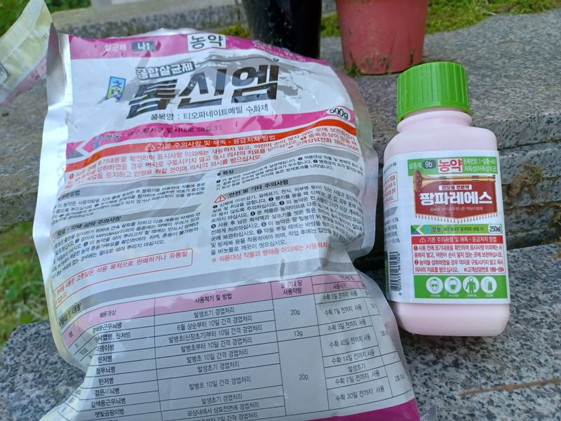 - 벼르고 벼려왔던 농약을 오늘하게 되어 마음이 후런하다. 살충제(모스피란), 살균제(델란), 200L