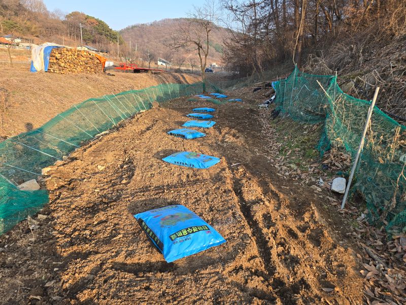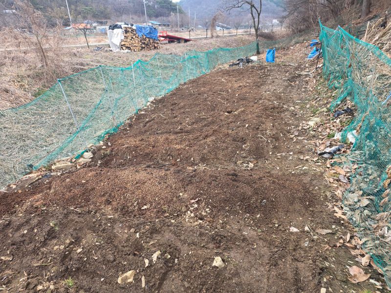 봄맞이 텃밭갈기 및 퇴비 ㅡ 올해는 고추농사를 해봐야 겠어요. ㅡ 벗섯 참나무도 전 부 쓰러트려 놓았어요