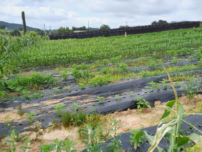 참깨 ㅣ0두렁 고구마 3두렁 옥수수 1두렁 청양고추 50포기 생강1두렁 땅콩2두렁 입니다