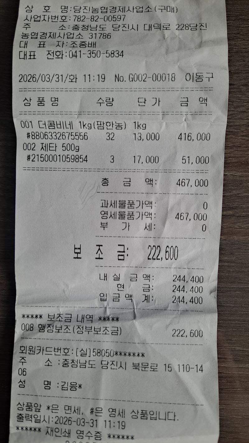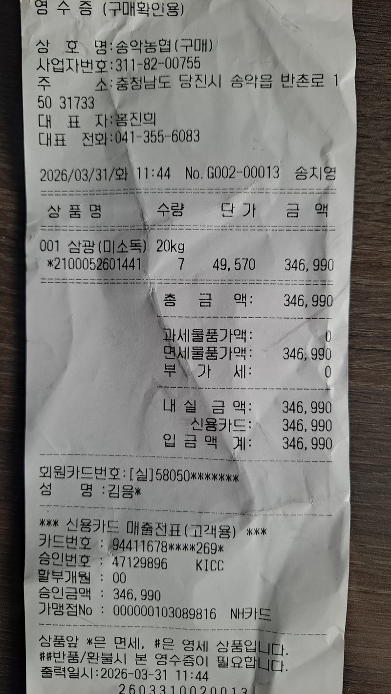 2026.03.31. 당진송악농협계약재배 삼광벼 볍씨(140kg)구매 및 소독약 등 육묘계약업체에 인계.