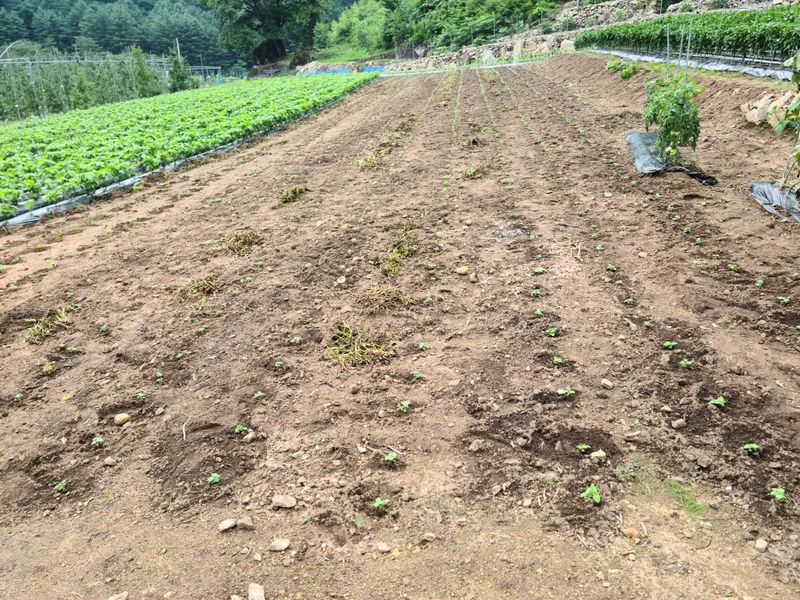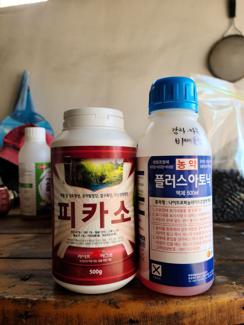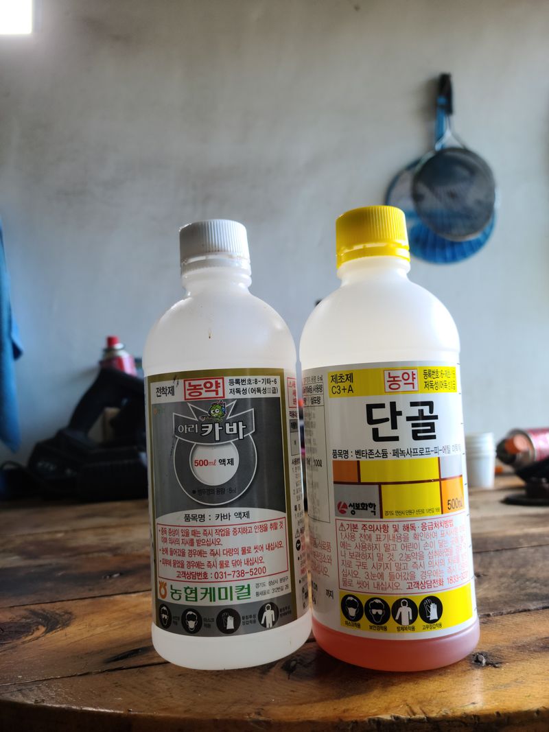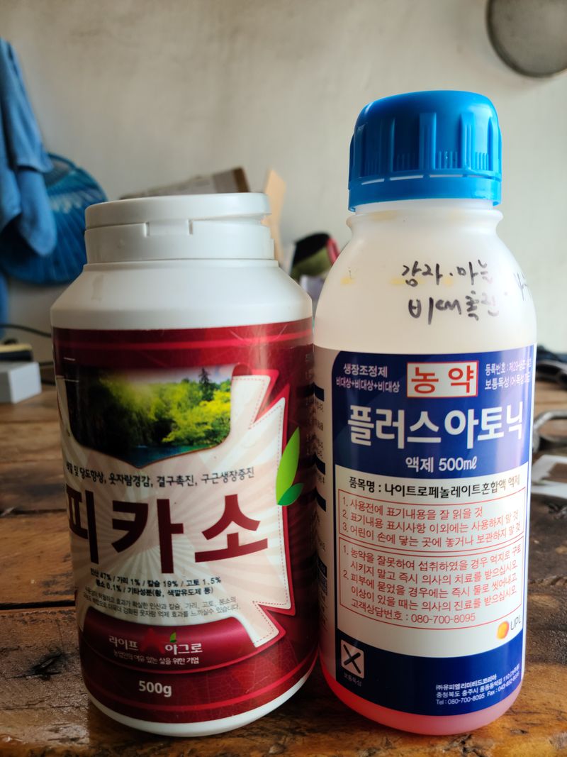 감자밭 영양제 및 방제약 살포-20리터-2통 근대왕-80ml-비대제 피레스-40ml-살충제 마늘밭 영양제 살포-20리터 -1통 근대왕-20ml-비대제 서리태밭 김매기