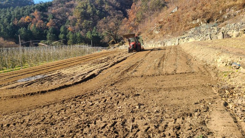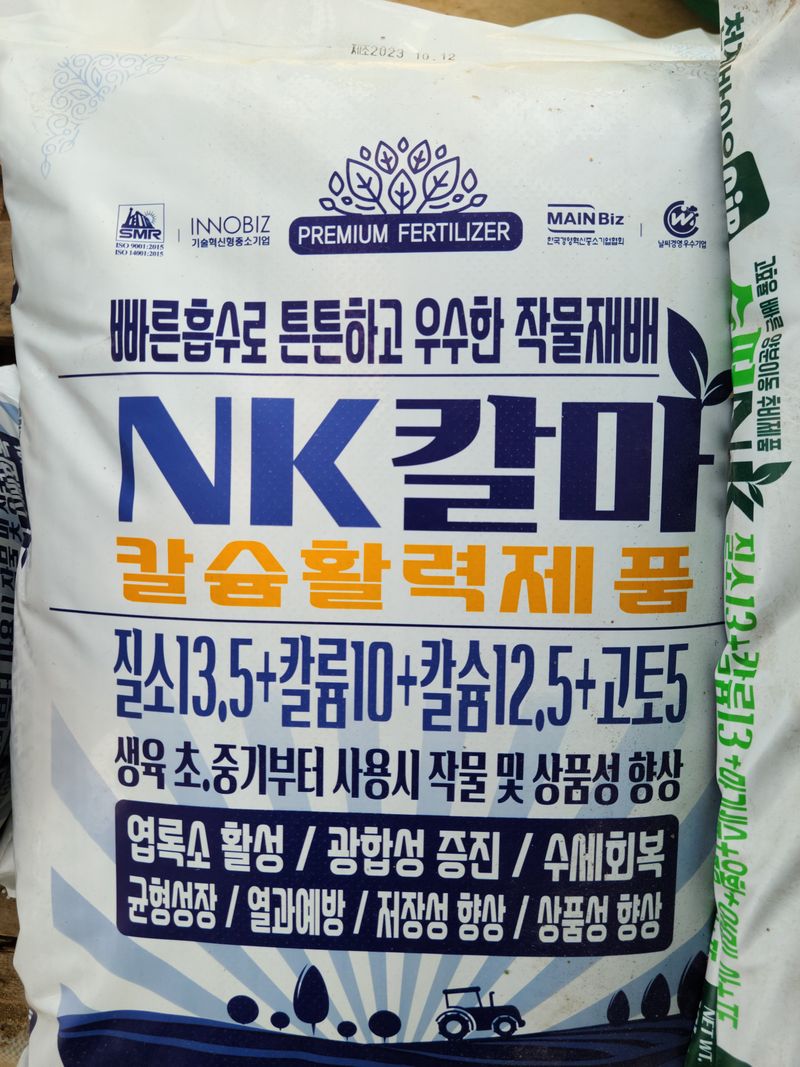 세척하여 건조기 투입 타작할 콩 경운기로 실어 들이기 마늘밭 만들기 토양살충제 2kg1포 살포 퇴비 15포 살포 Nk복합비료 20kg 1포 살포 황산가리 5kg 살포후 경운작업