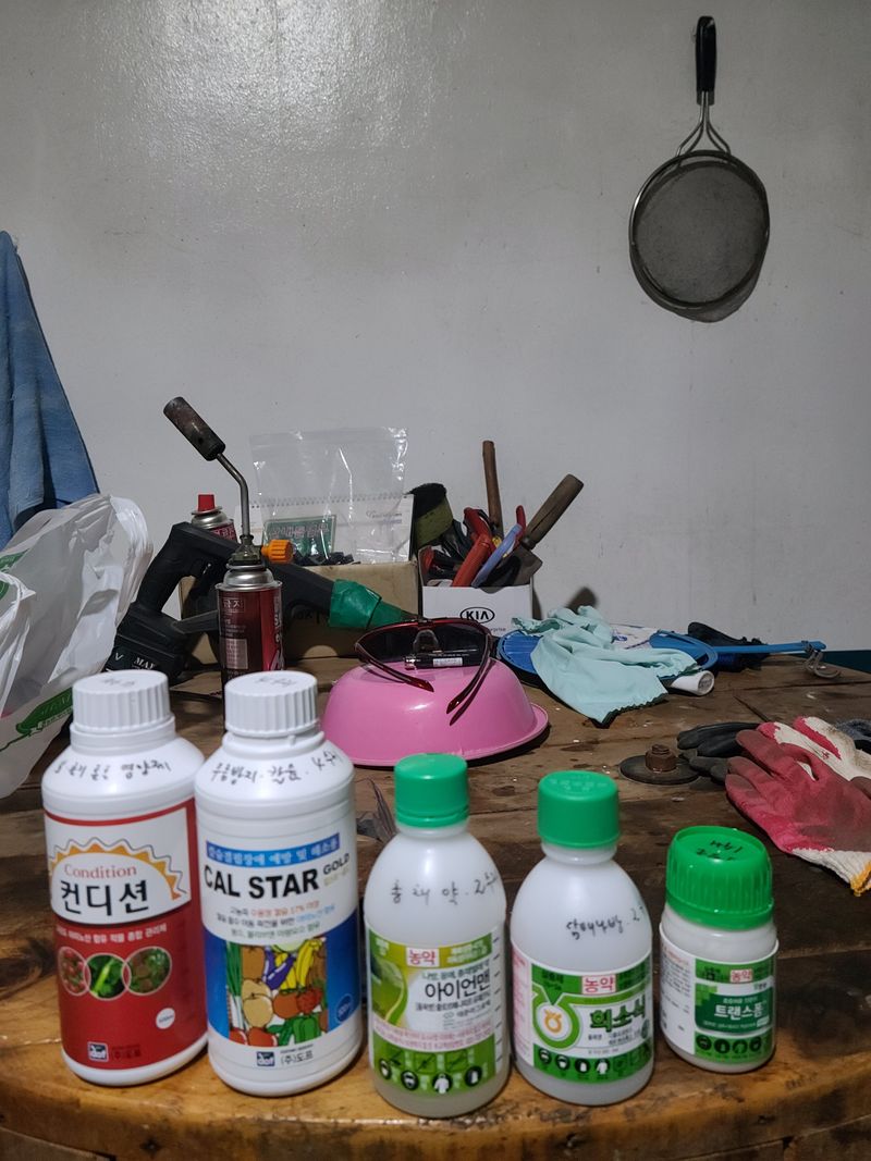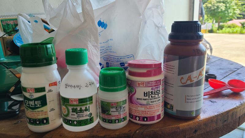 하우스고추 방제 및 영양제 살포(60리터) 희소식 ㅡ60mlㅡ총채,담배나방 살무사ㅡ30mlㅡ진딧물,나방. 균가이버ㅡ30mlㅡ탄저병 써프라이즈ㅡ120mlㅡ개화,결실촉진 칼슘파워ㅡ120mlㅡ무름방지,칼슘