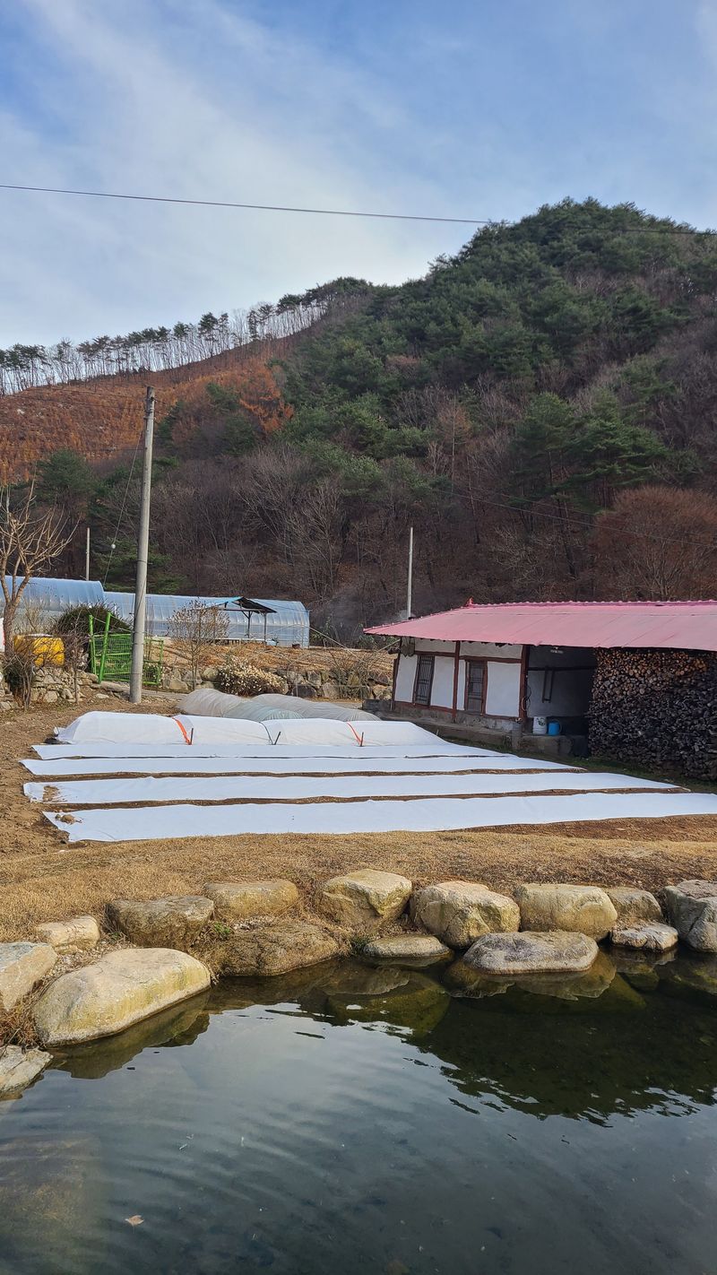밭에 덮어 놓았던 배추를 뽑아 하우스로 옮겨 심고 보온덮개로 덮었다, 겨우내 먹을거를 저장했다.