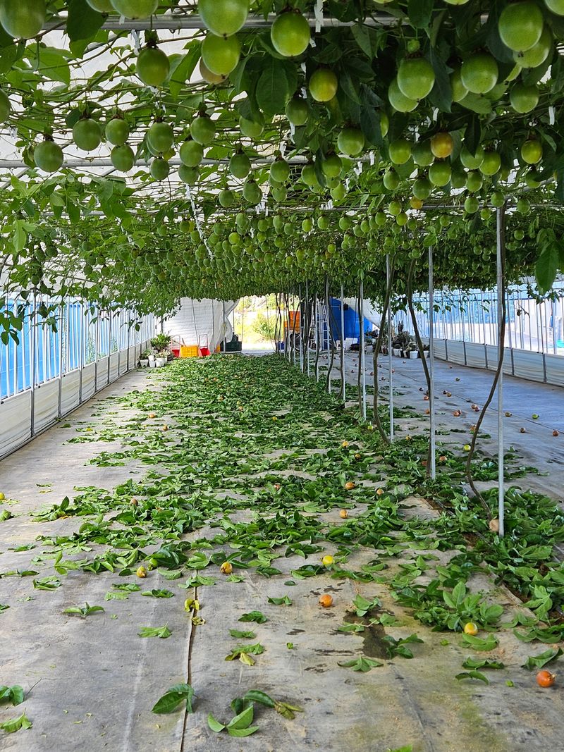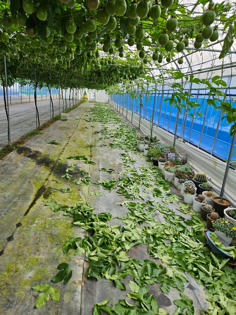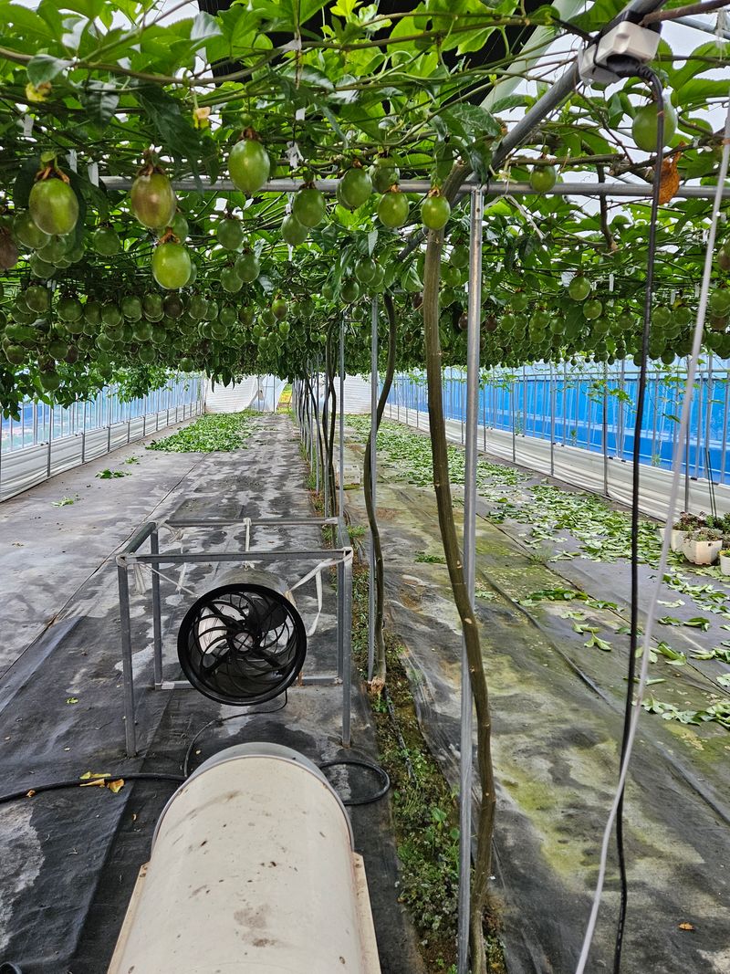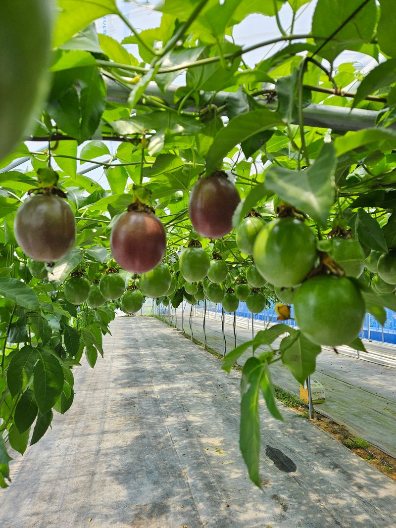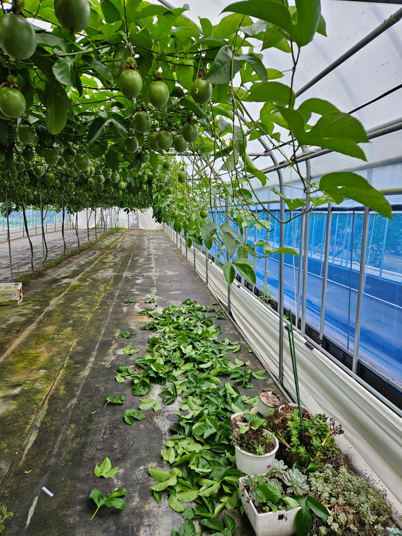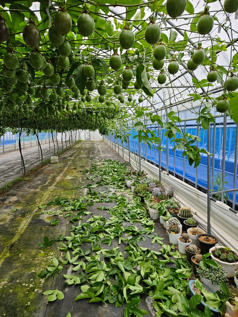 올해는 남부지방 장마가 벌써 끝나고 무더위가시작 된것같다.강누량 부족이 열려되고 다른작물 흉작이 예상된다.백향과 본격적으로수확하기 전 2차 수확을위한 이파리제거 및 이틀마다1시간씩 관수 해주고있음. 아열대작물이지만 낮에 너무 무더워 천창차광막을펼쳐 햇빛차단도 하고...