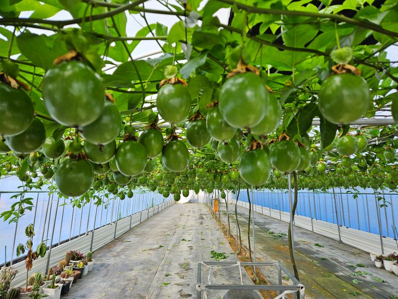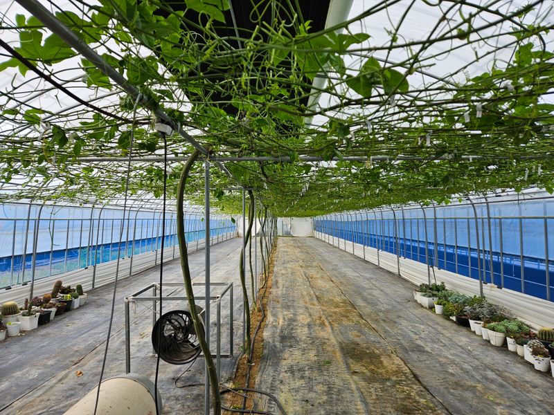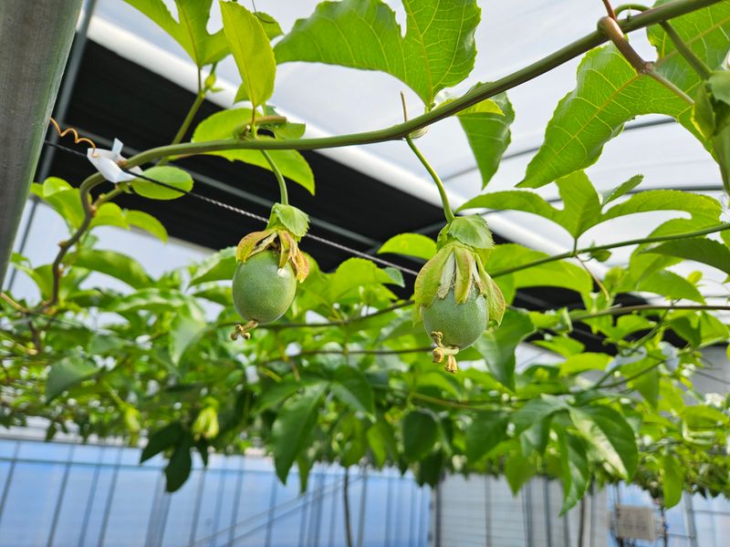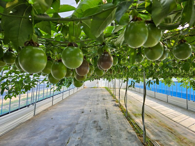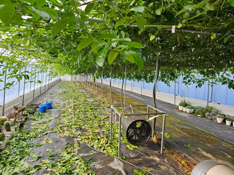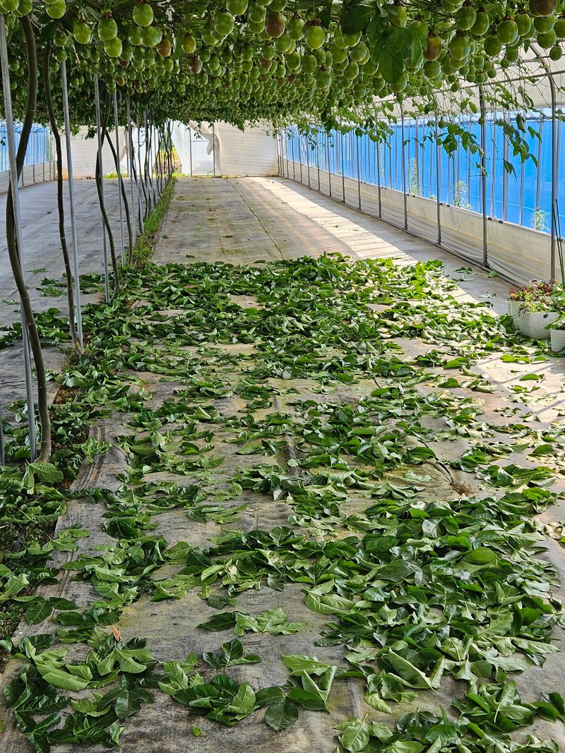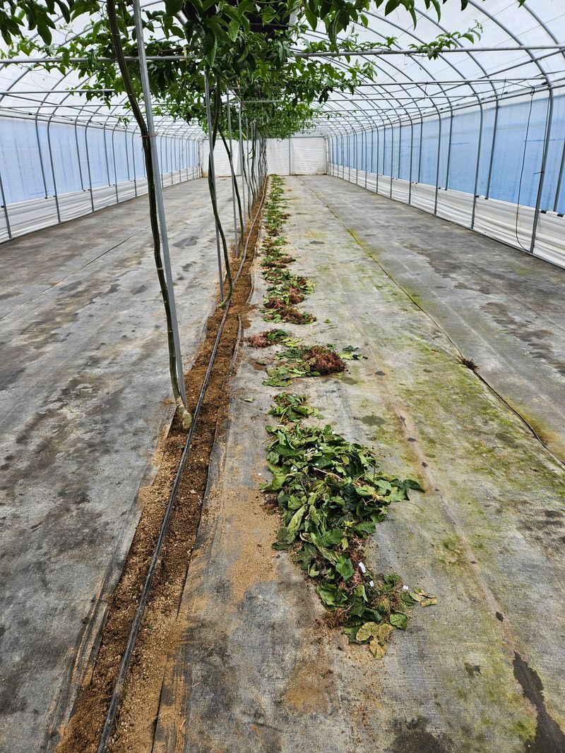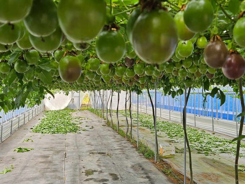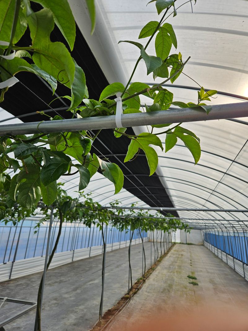 올해는 남부지방 장마가 벌써 끝나고 무더위가시작 된것같다.강누량 부족이 열려되고 다른작물 흉작이 예상된다.백향과 본격적으로수확하기 전 2차 수확을위한 이파리제거 및 이틀마다1시간씩 관수 해주고있음. 아열대작물이지만 낮에 너무 무더워 천창차광막을펼쳐 햇빛차단도 하고...