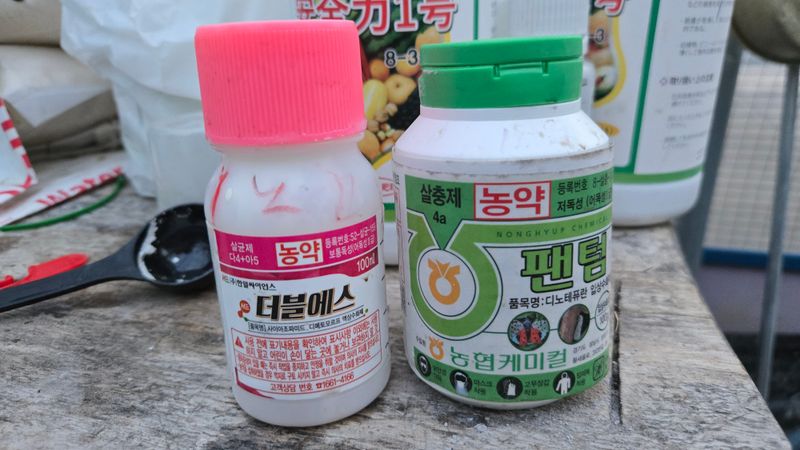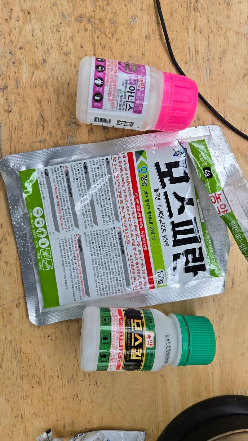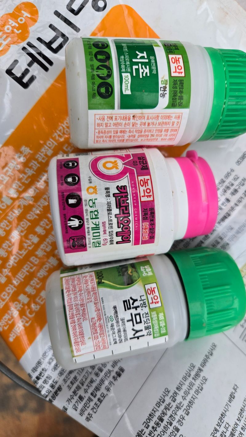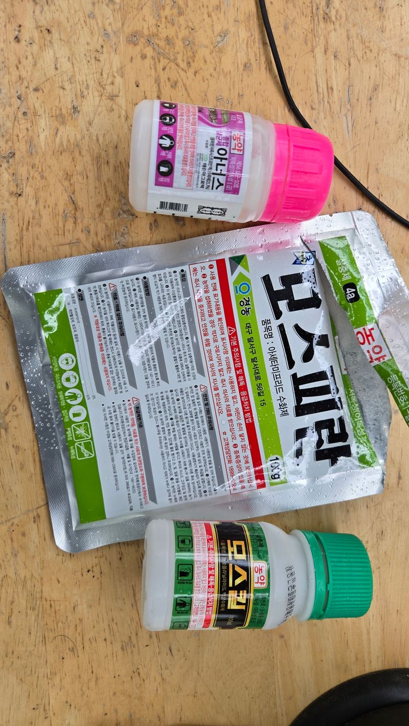 병충해방제 응애 노린제 깍지 노균 탄저 나방 진딧물 살무사 살충제 100ml 2병 커브리오에이 살균제 2병 지존 살충제 100ml 2병 물ㄹ 400 리터 혼합 옆면시비 완료
