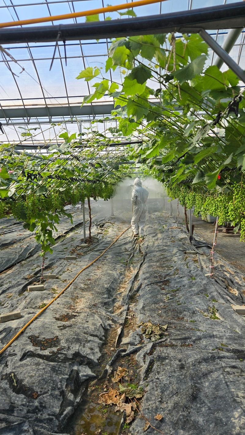 오전 포도원 골타기 작업 진행 병충해 방제 스미치온 300 미리리터 벨리스플러스 100 그램 물 200라터 혼합하여 스프링쿨러 살포 물20톤관주