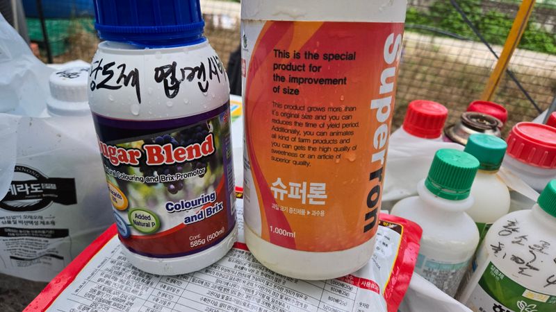 오전 포도원 순정리 순자르기 집게 유인작업 적심작업 관주 나르갠 500g1봉 스프링쿨러 살포 붕사 칼인마그 혼합 스프링쿨러 살포