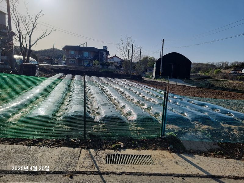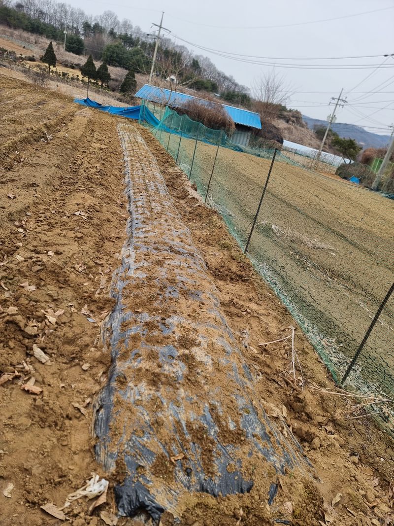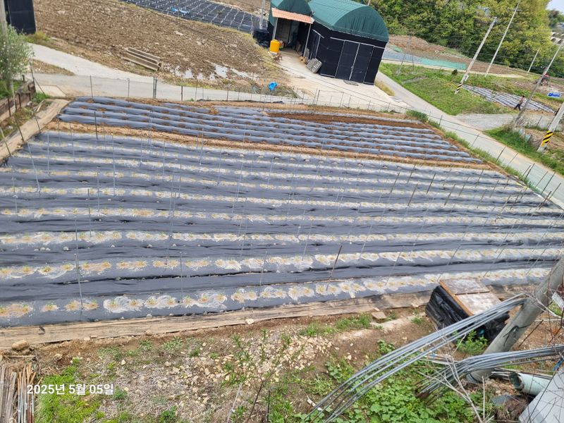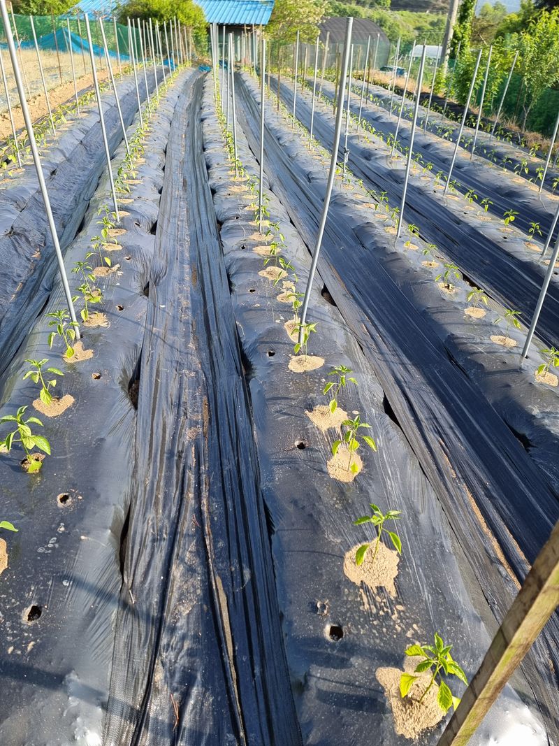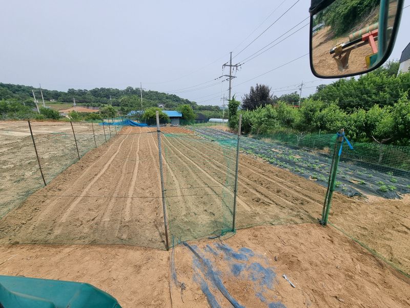 5월초에 고추모 600주 내려고 트랙터로 로타리치고 이랑 만들고 비닐 씨웠어요 그리고 동물방지용 울타리도 설치완료
