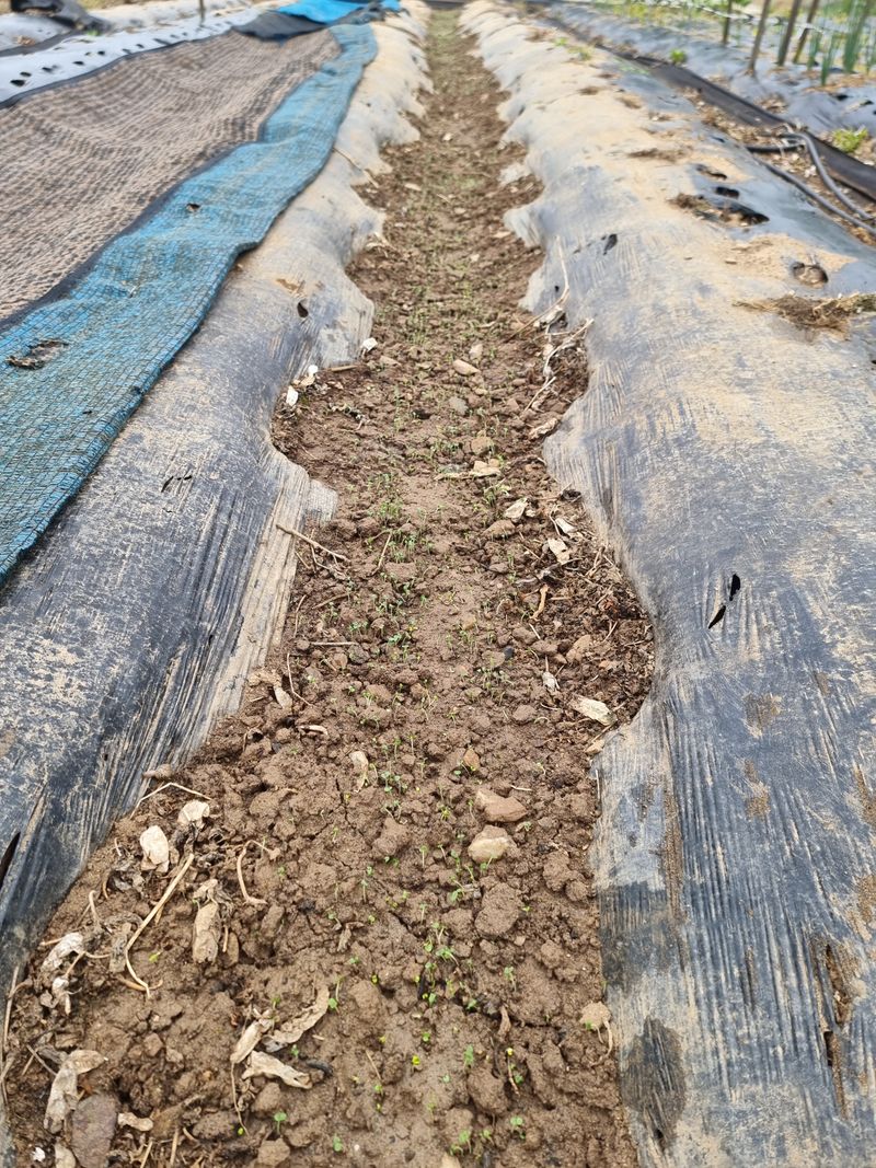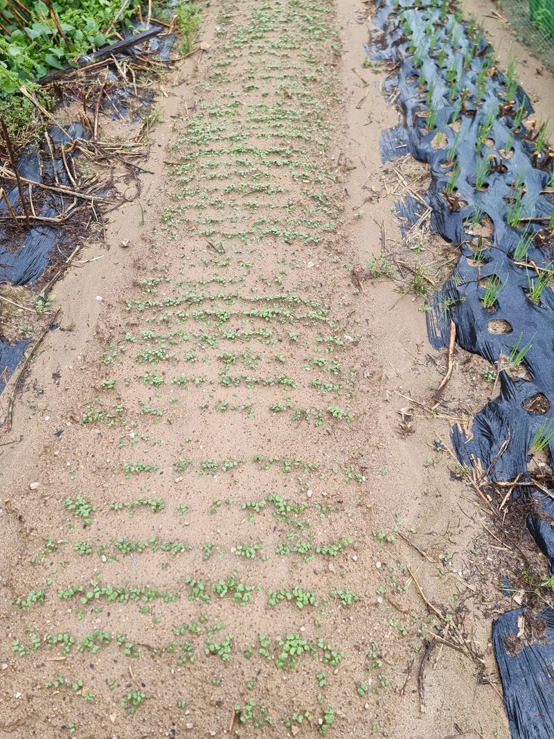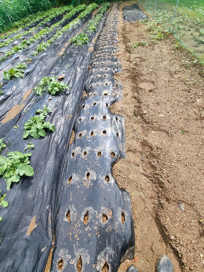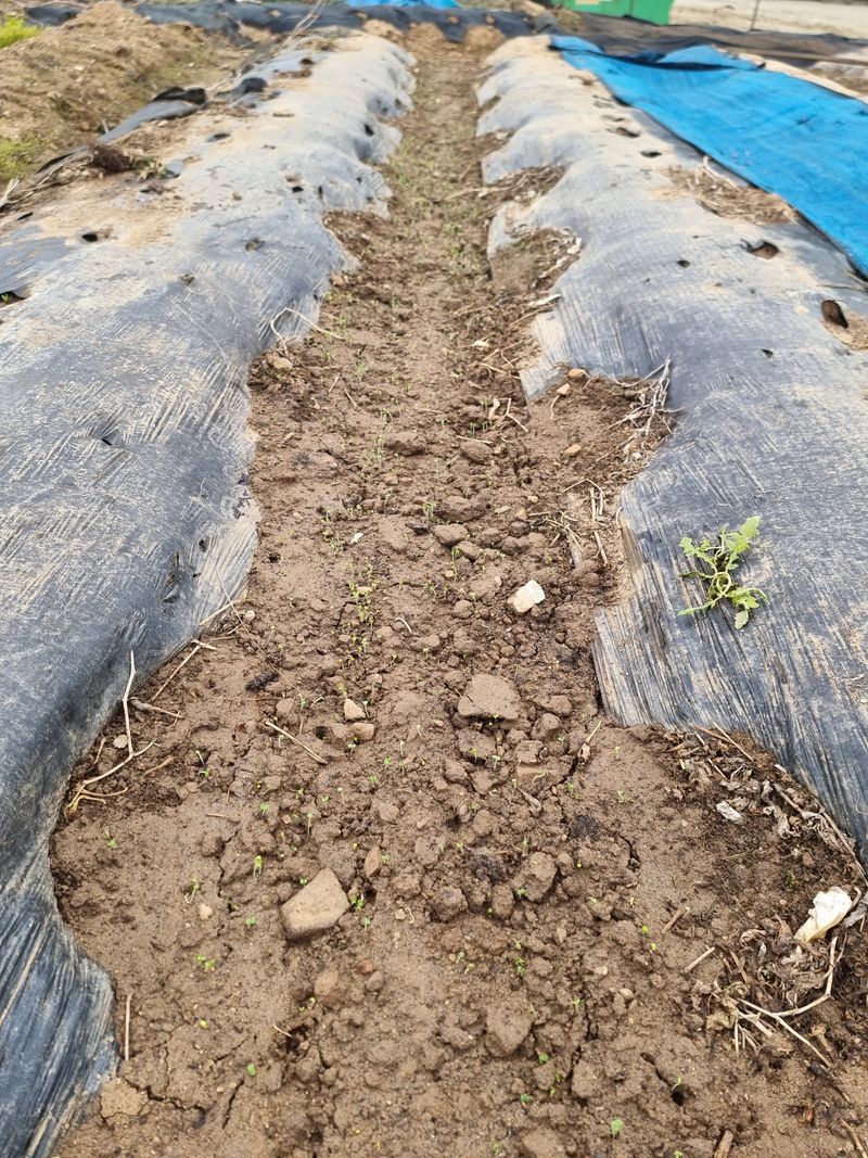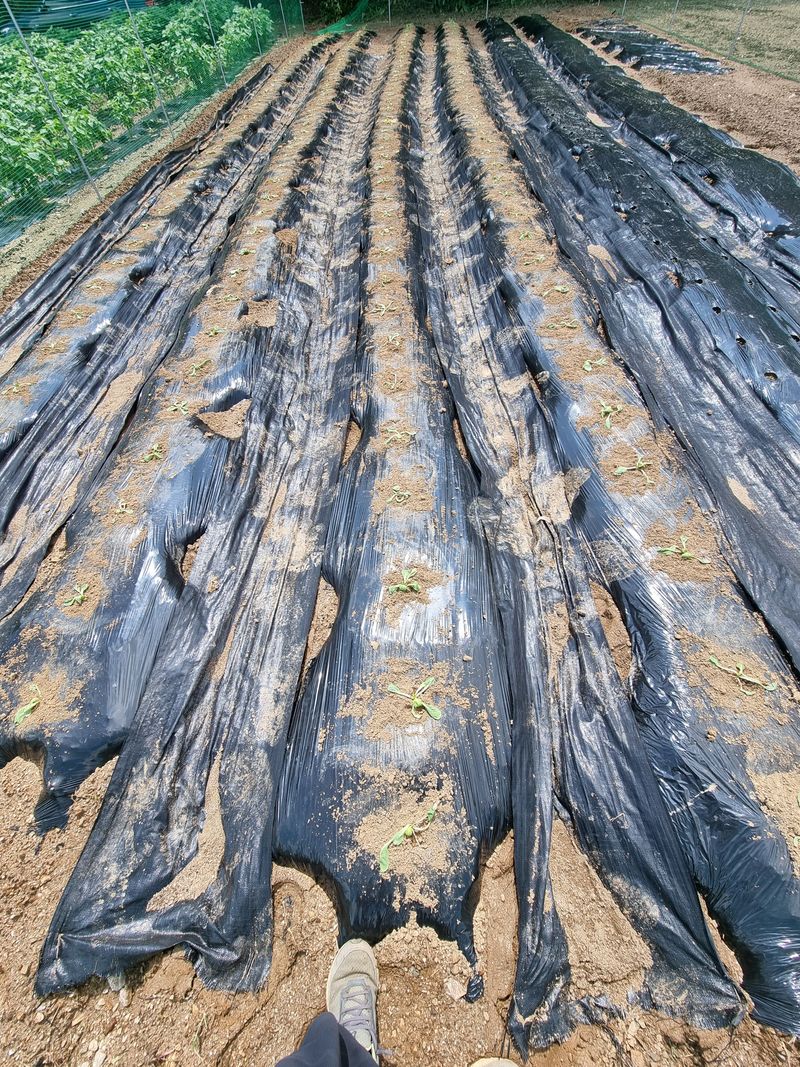 수요일부터 비예보가 있어 무 씨앗을 한 이랑 먼저 심고, 고랑에 제초매트 깔아 놓음. 남은 씨앗은 줄뿌림 해놓음