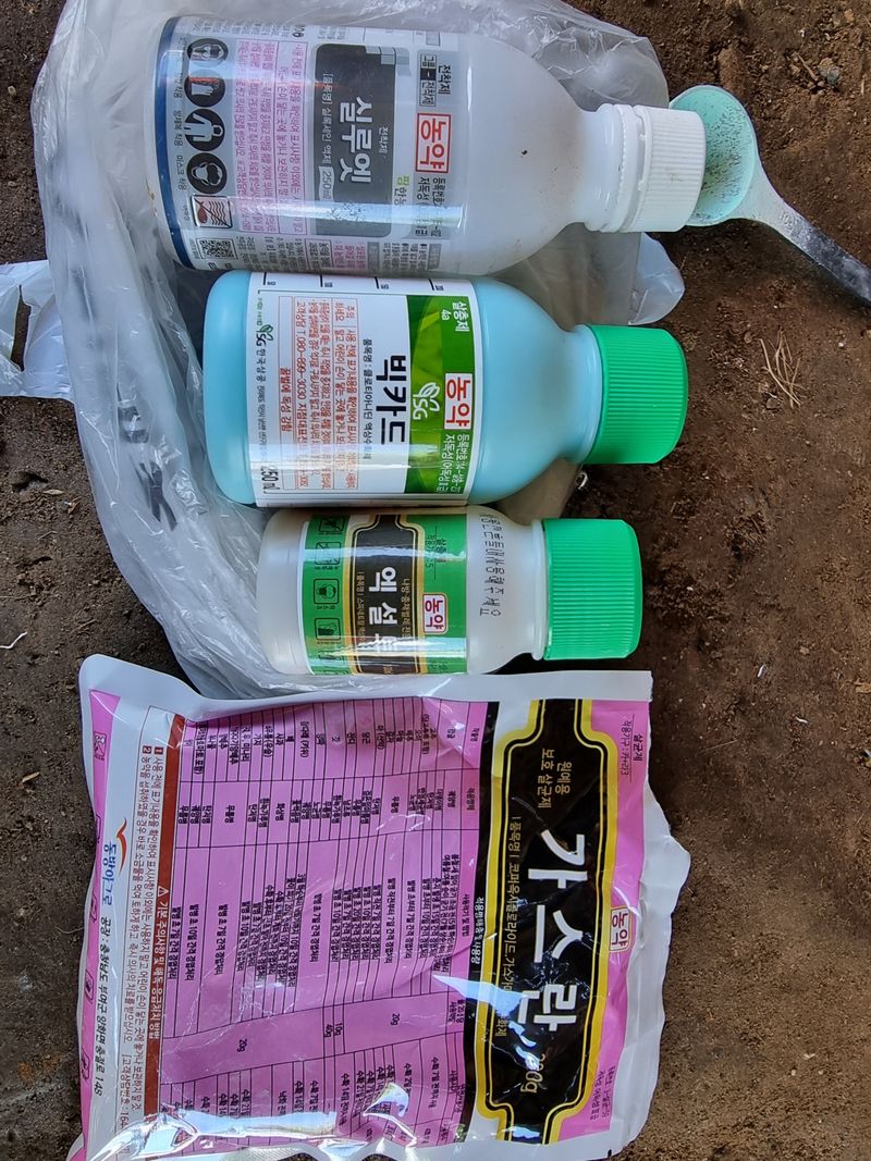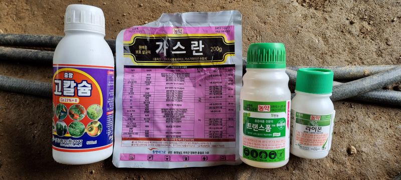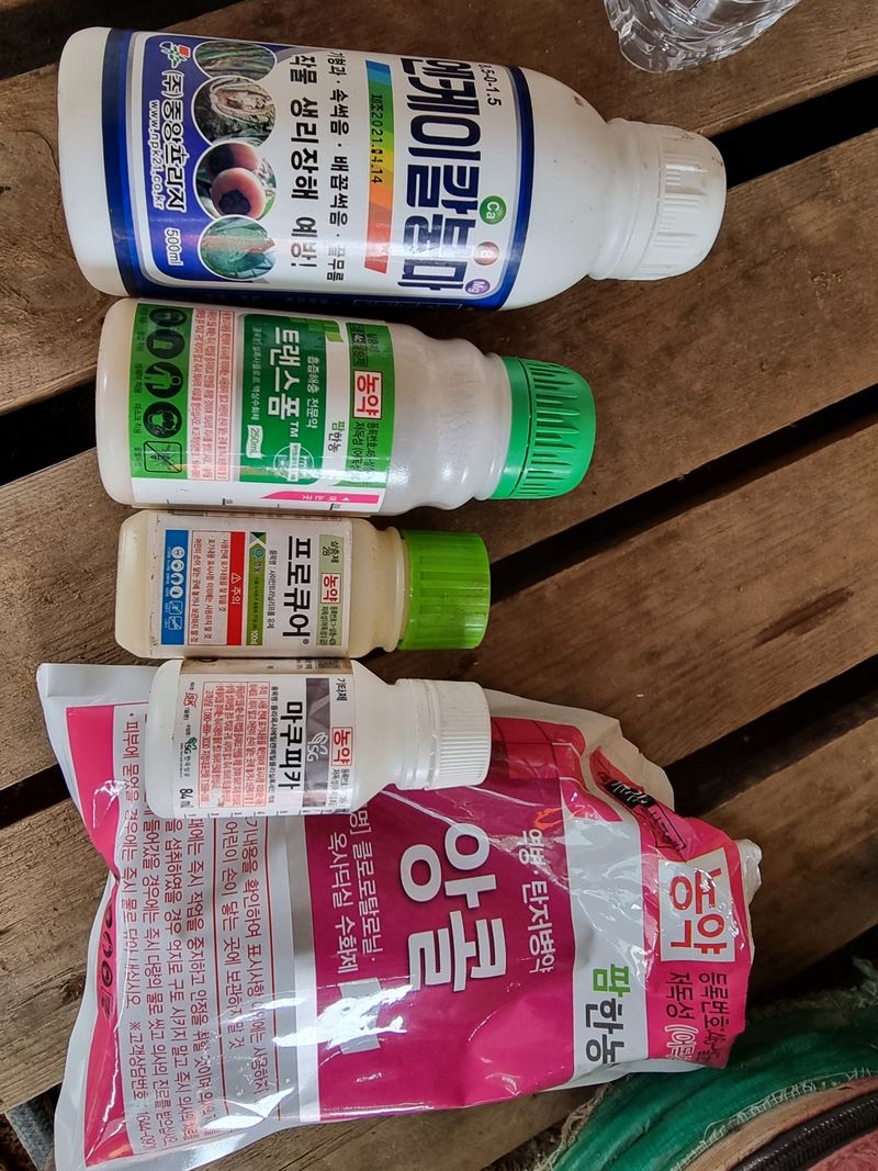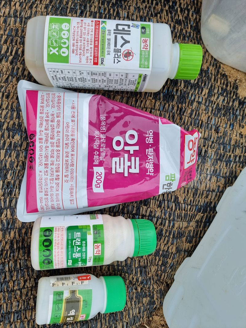 주말마다 다행히 비가 멈추어주어서 병해충 방제를 할 수 있어서 다행입니다. 오티바 60ml. 트랜스폼 60ml. 나노진 60ml. 돌격대 60ml. 칼슘제 100ml. 침투제 15ml 방제