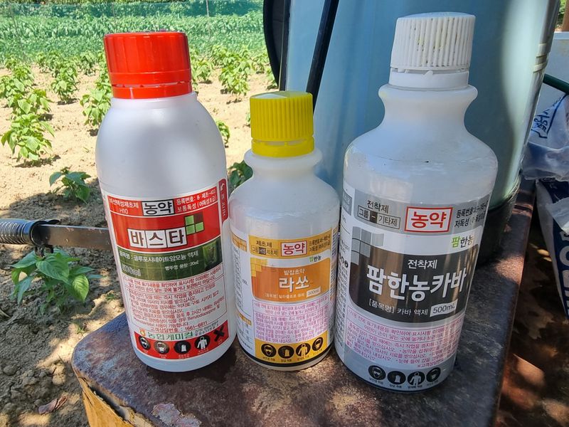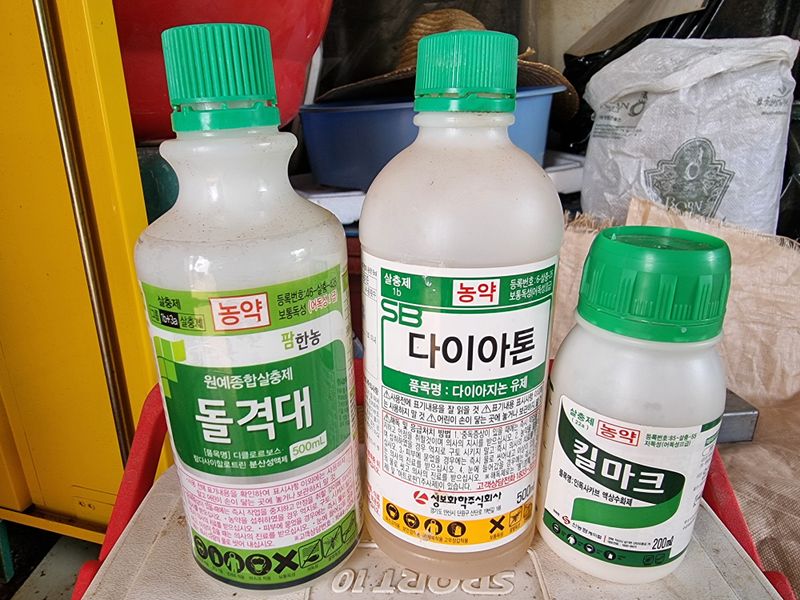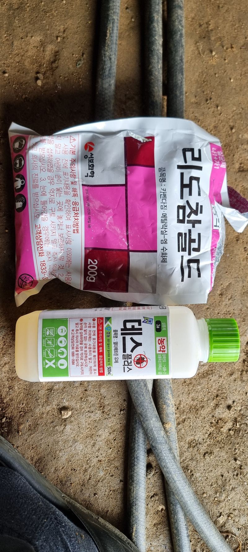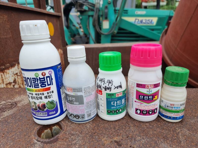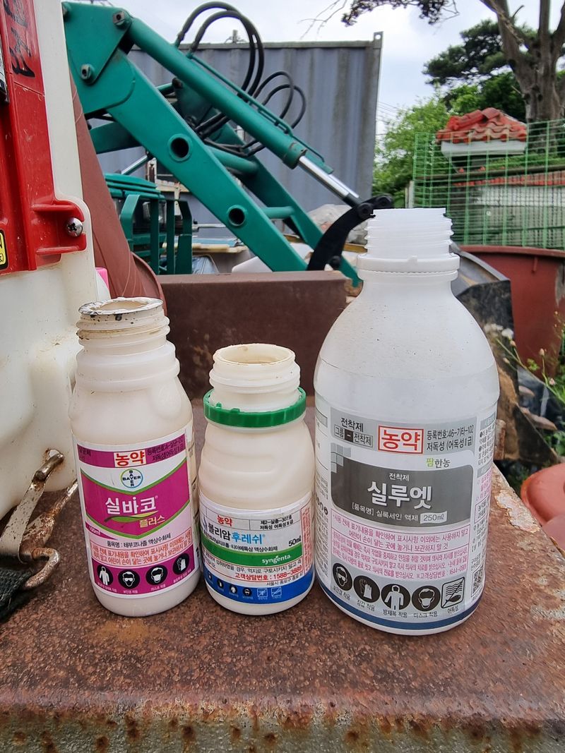 주말마다 다행히 비가 멈추어주어서 병해충 방제를 할 수 있어서 다행입니다. 오티바 60ml. 트랜스폼 60ml. 나노진 60ml. 돌격대 60ml. 칼슘제 100ml. 침투제 15ml 방제