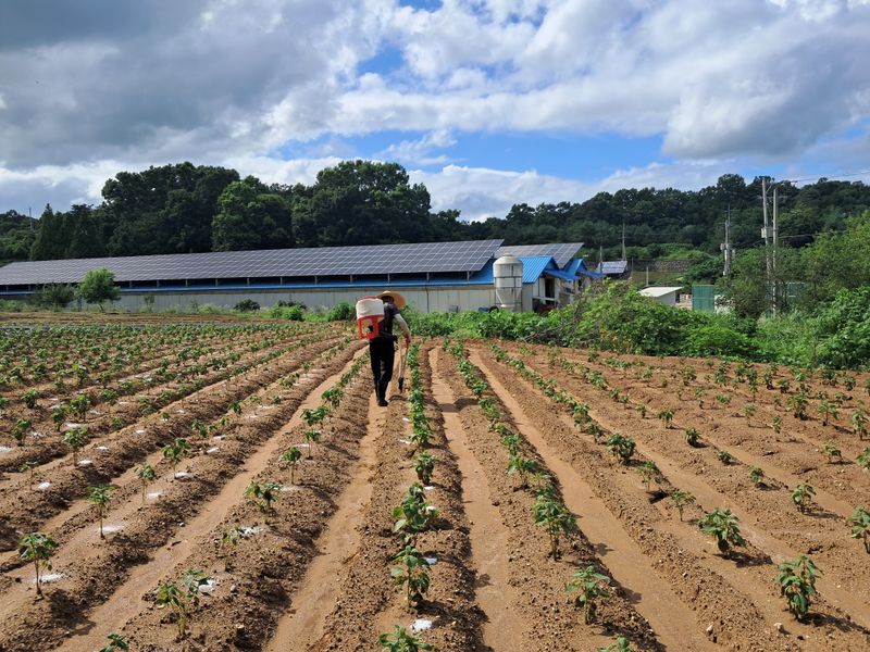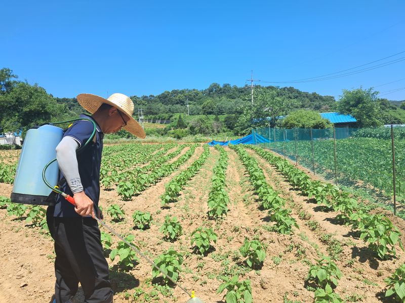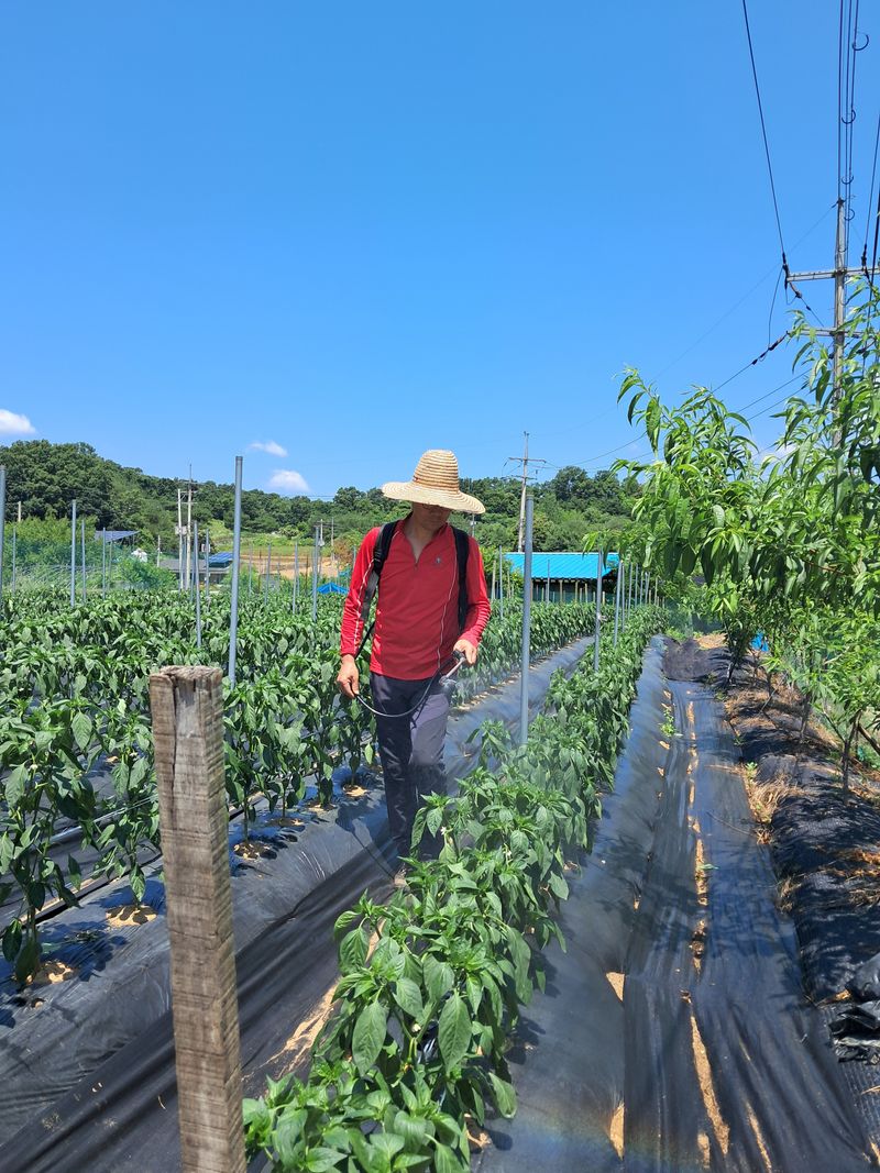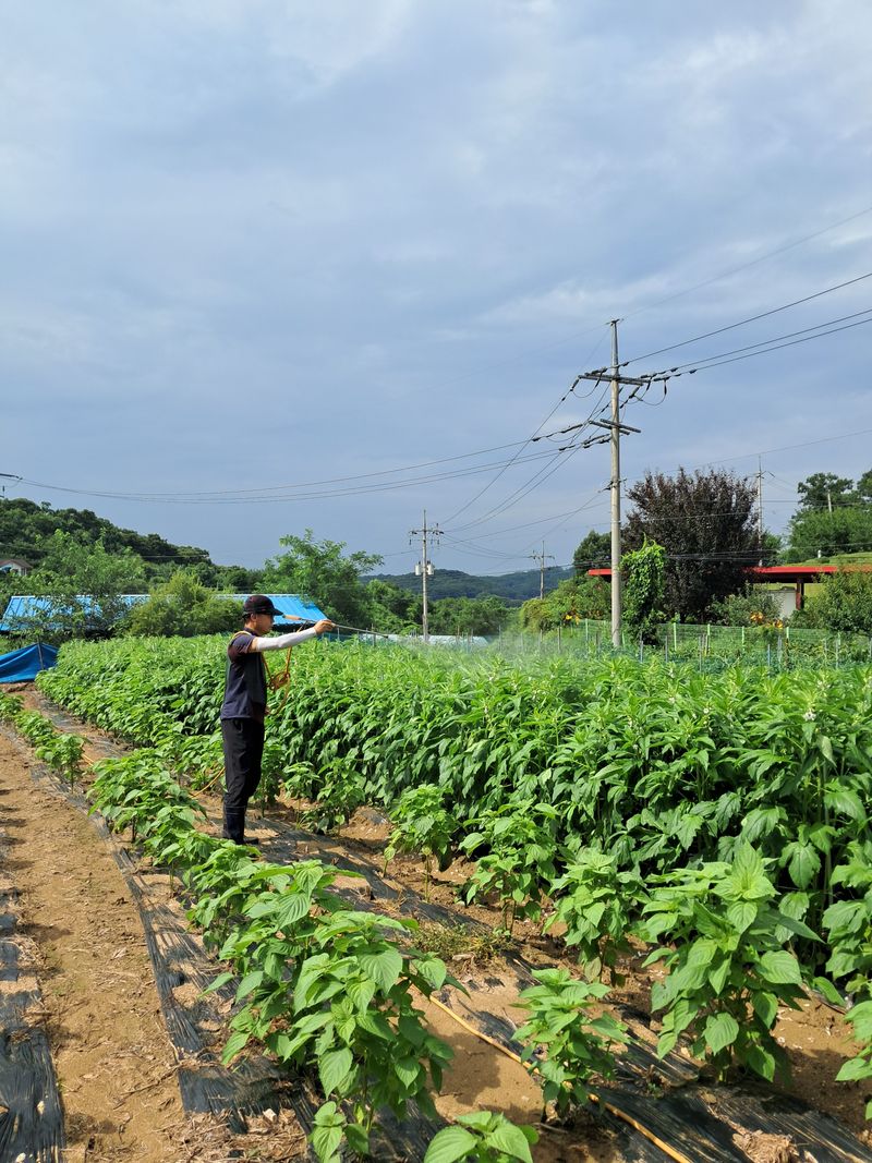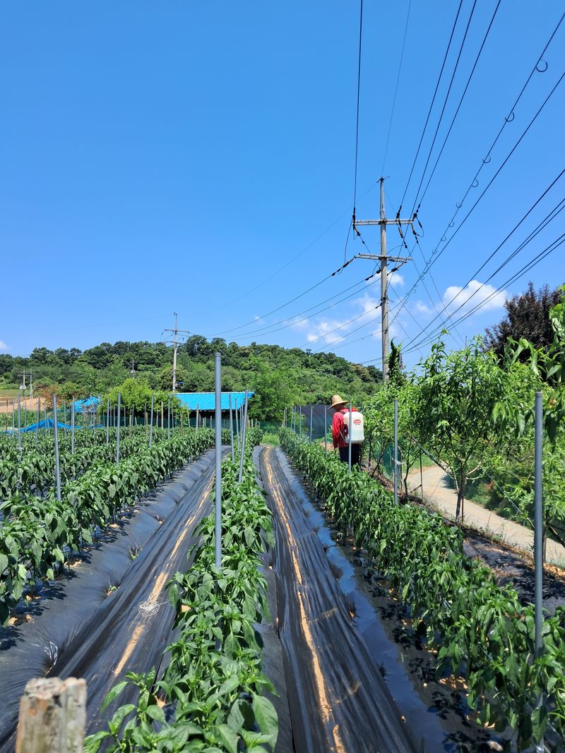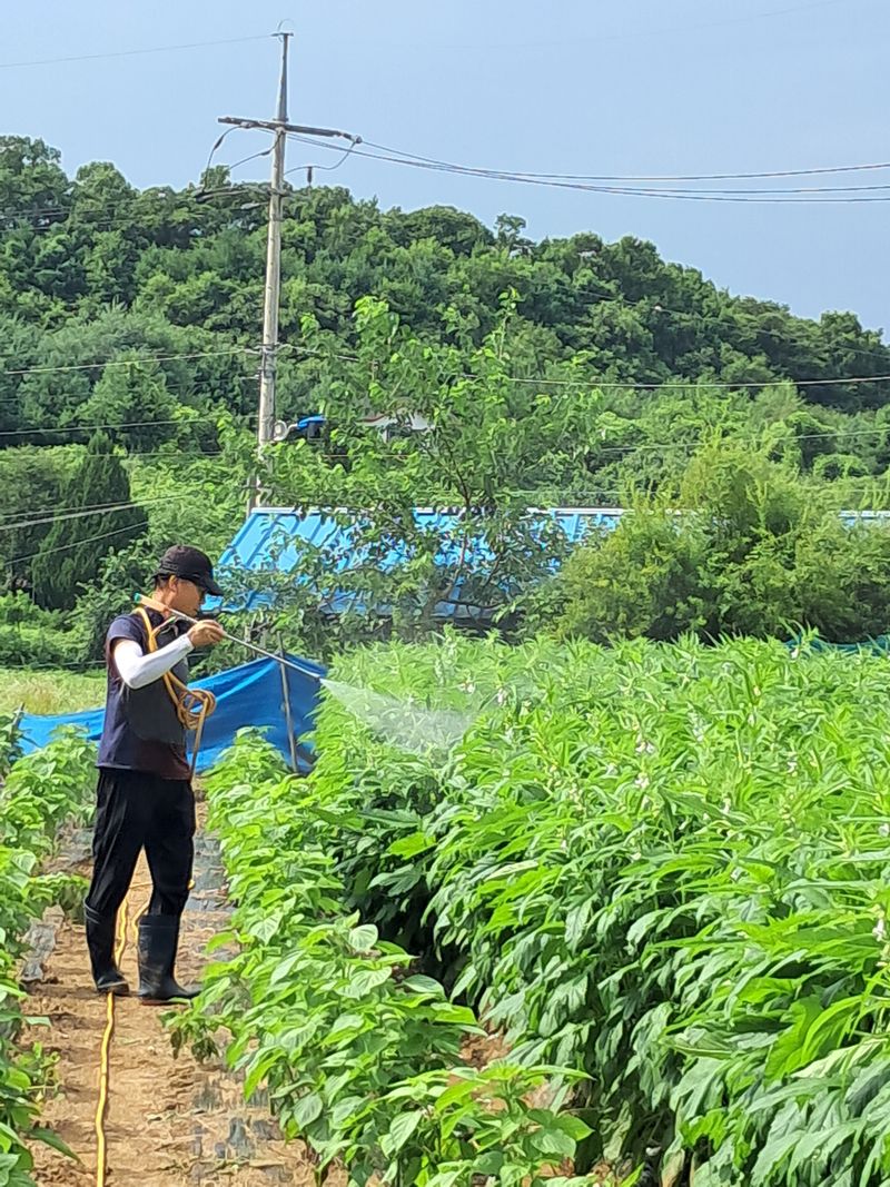 고추 방제 및 들깨 중거름 시비 비 그칙고 오늘 이후 비 없어서 4시부터 한시간반동안 들깨와 팥에 비료주고 6시에 고추 방제하고, 이제 일 마치고 귀가