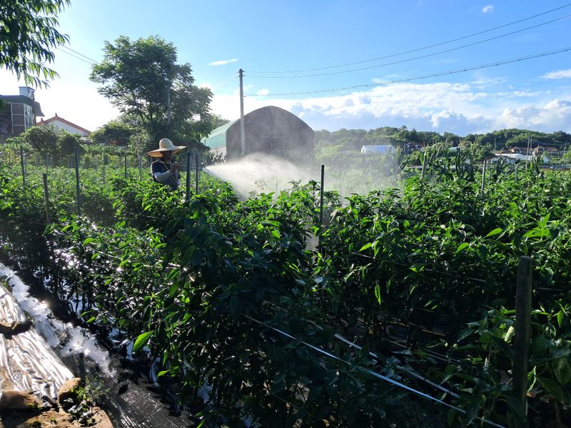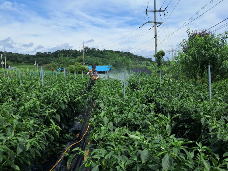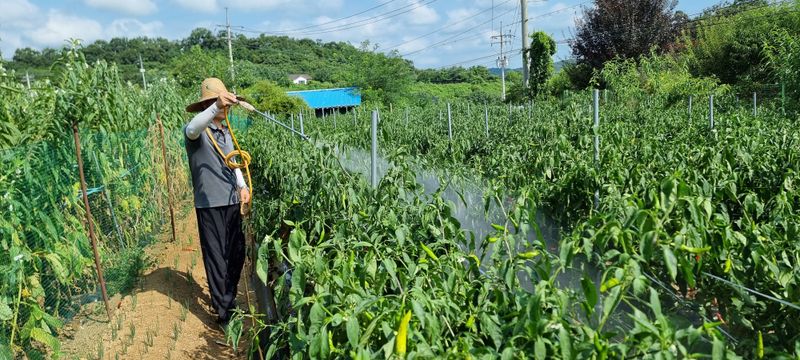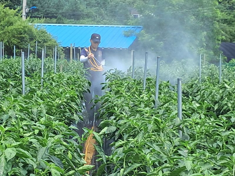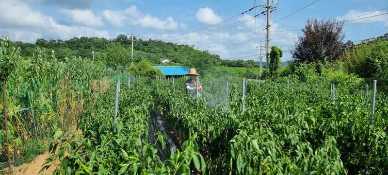 배추에 청벌레가 있어서 살충제 살포하고. 고추에도 6물째 따고 농약 살포함. 내일 하루종일 비가 오락가락한다고하여 늦게까지 농약 살포함