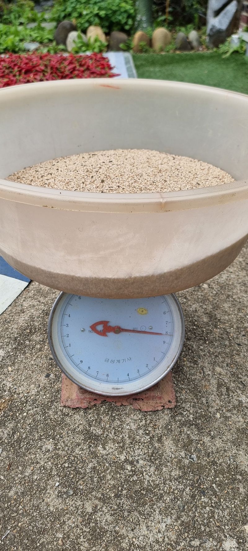 퇴근하고 시골집에 와서 임시로지은 비닐하우스에서 참깨 털었어요 덜 마른 상태로 7kg되네요 지금 상태면 3말(18kg)정도 예상해 봅니다