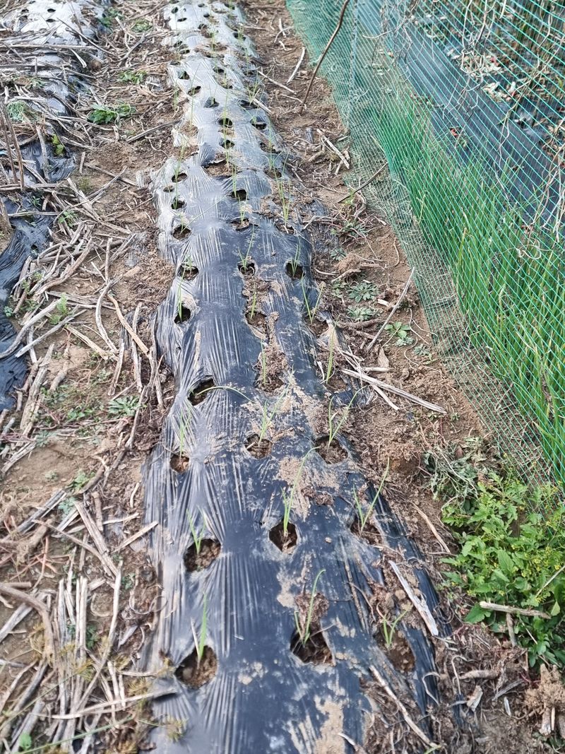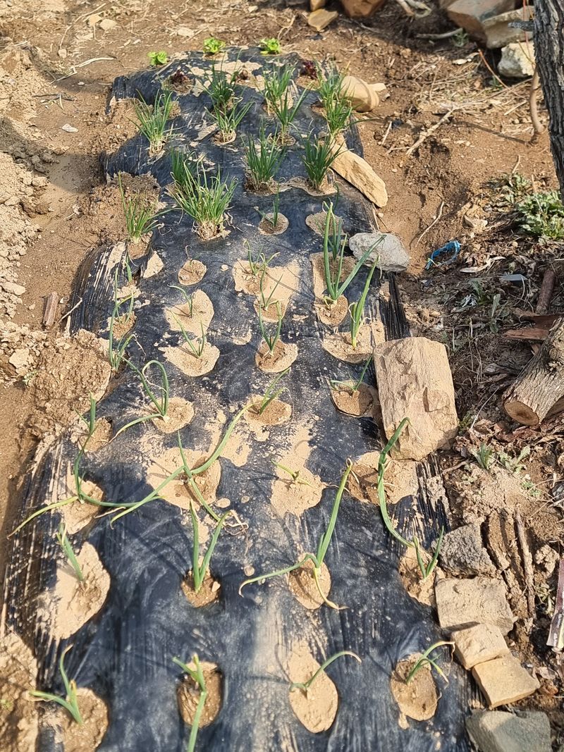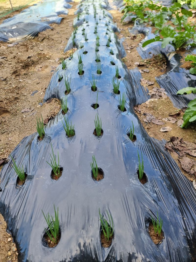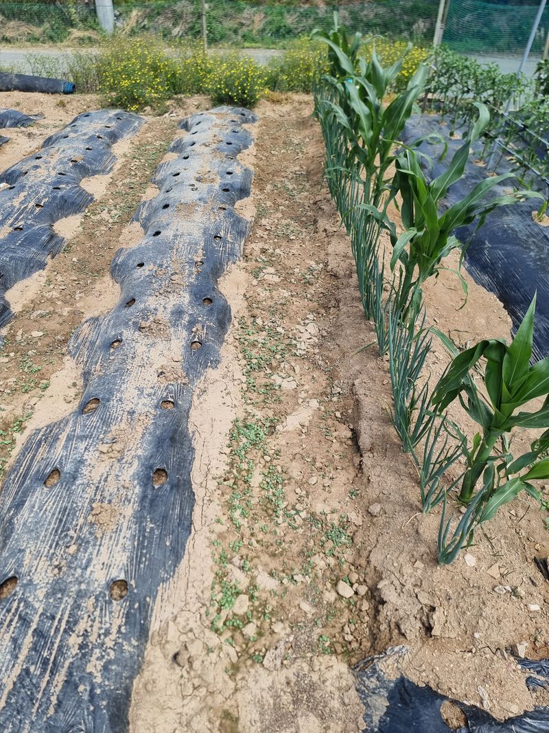 양파 600개 심음 자색 300개. 일반 300개 사서 심었습니다. 원예비료. 알균제.살충제.영양제등 뿌리고 로타리 작업.비닐 피복후 심었어요