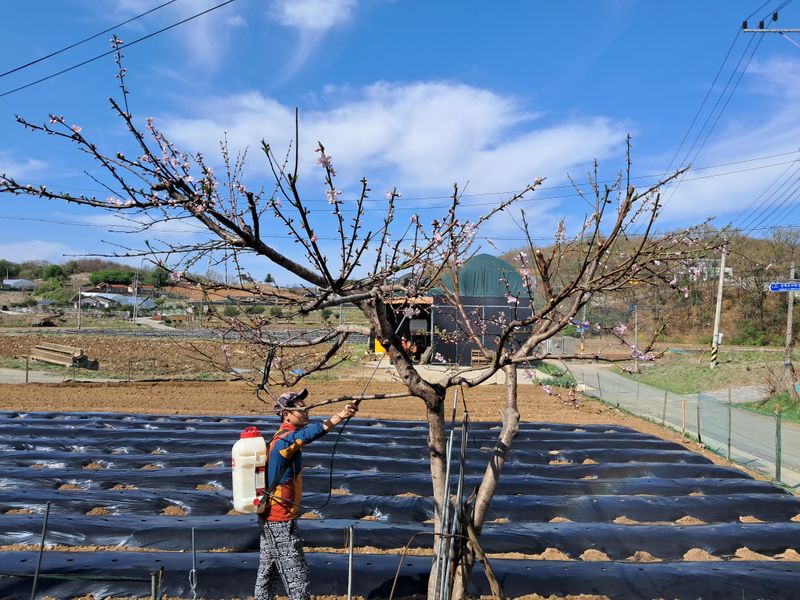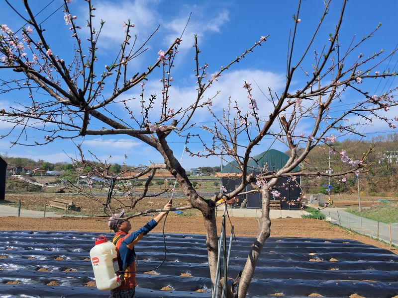 복숭아 나무에 꽃이 피고 있어서 살충제방제