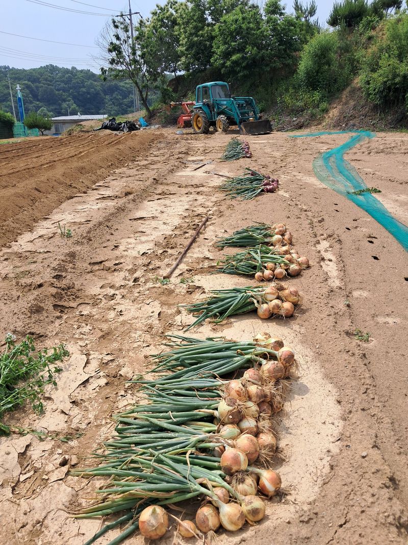 자색. 흰 양파를' 뽑았습니다. 예상보다 잘커서 양이 많았습니다 백태(대원콩)도 트랙터로 로타리치고 파종기로 심었어요