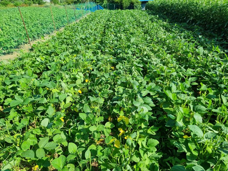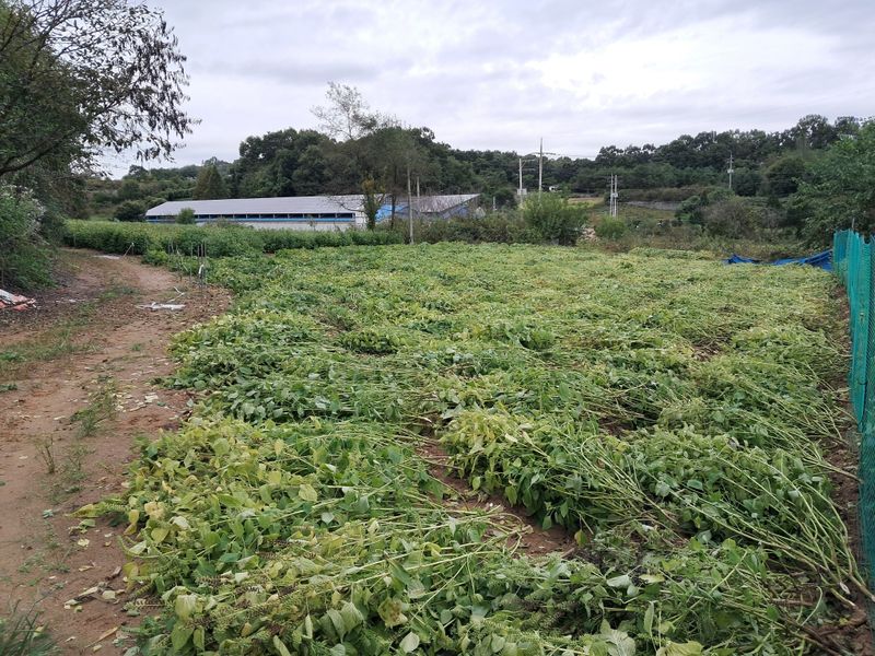 비가와서 고추 가지가 처지고 찢어져서 오후 휴가내고, 고추 4번째 줄 띠우고. 서리태콩 순지르기 작업 완료