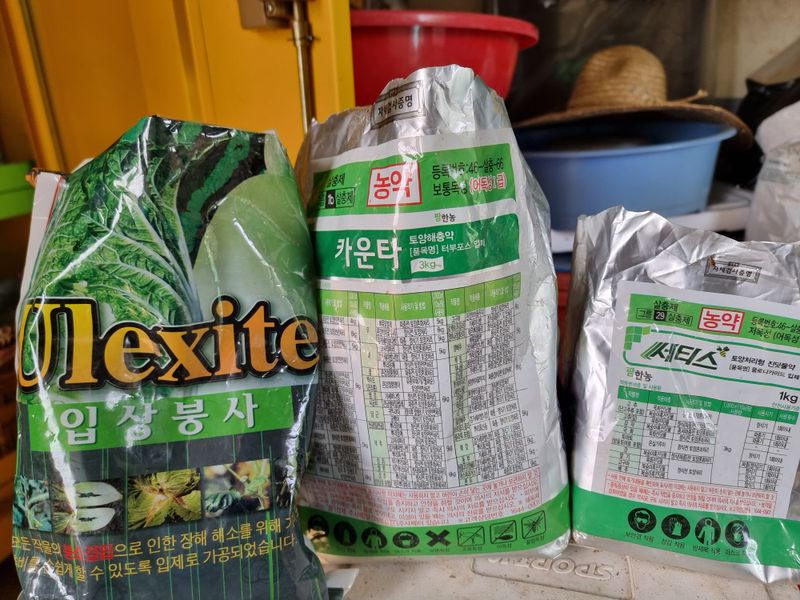 김장 배추 심을 토지 경운 및 피복 원예용비료 붕산비료. 다이아톤입제(벼룩입벌레). 세티스(진딧물약) 살포 김장배추는, 15일 식재 예정