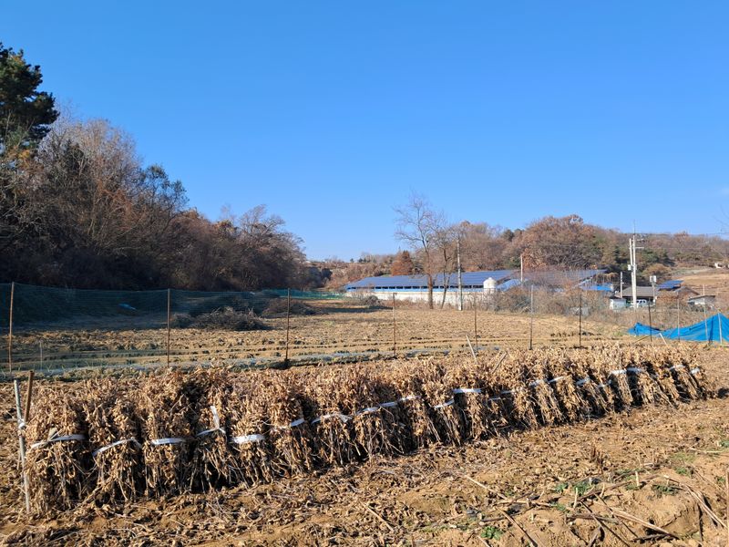 서리태와 백태 콩 꺾어서 세워놓았어요 당분간' 비예보가' 없어서 비닐은 씌워놓지 않고 말리려고요