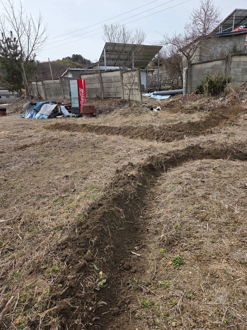 갑자기비예고가있어 고구마캐고그곳에 도랑만들어비닐멀칭후 마늘파종