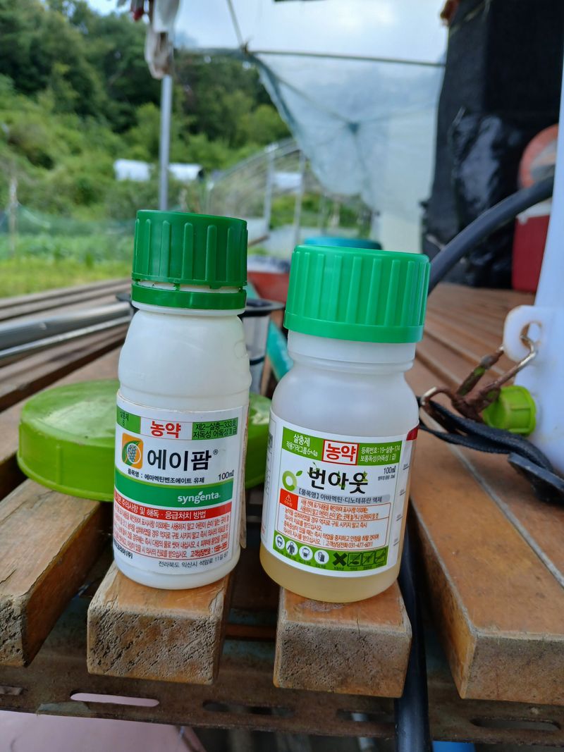 어린 새싹에 애벌레가 있어 농약 에이팜 물한말기준 10 ml 동력분무기로 살포함