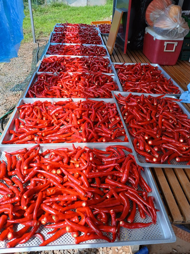 홍고추 세척하여20시간 물빠짐 실시후 온도50도에 60시간 건조 조건 실시함