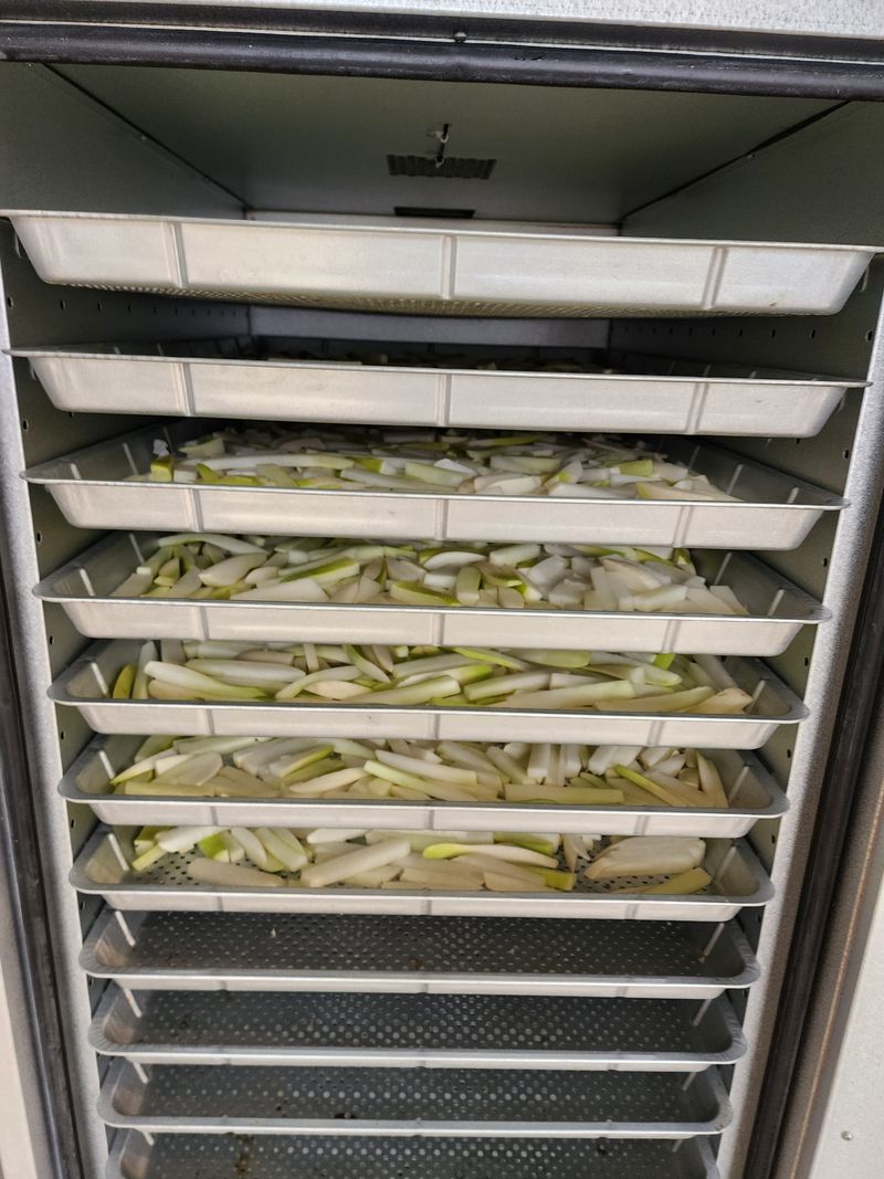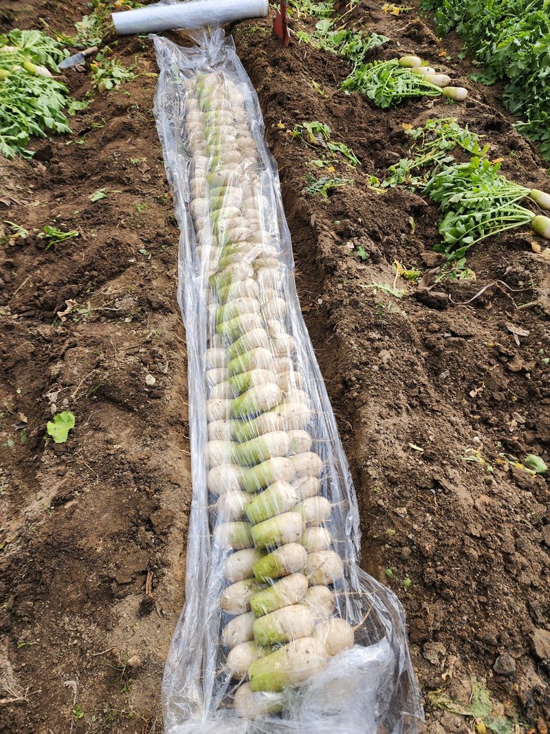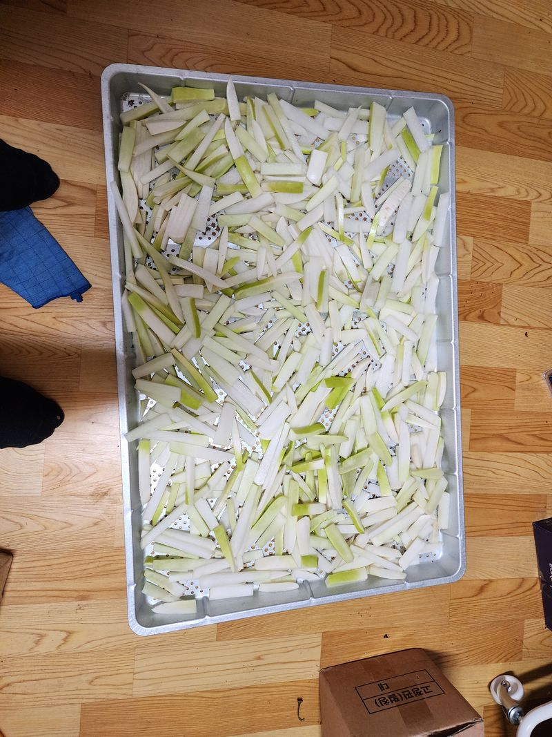 무우땅속에 저장하고 무우마랭이 건조기에 건조하고 여름반찬 으로 최적임 무우잎 시래기 작업함
