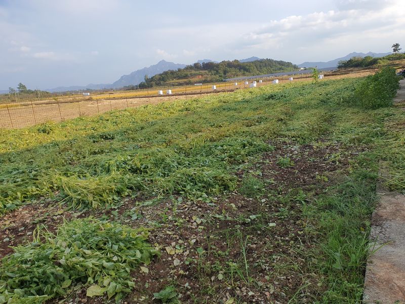 들깨가 키가 커서 낫질이 힘들었다 두번쳐서 베어내고 나란히 널어둠 햇볕 바람에 잘 마르면 두드려야겠다