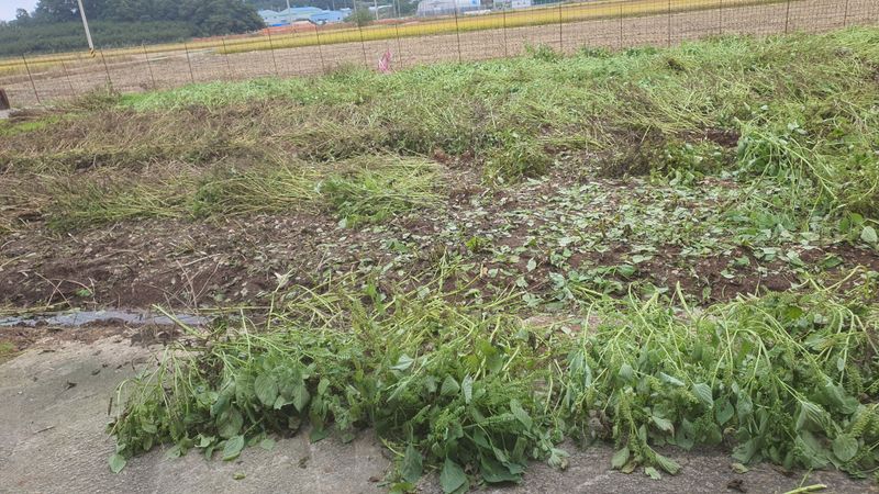들깨 풀약했으나 안죽은 풀 폽아내기함 오후에 소나기가 와서 땅이 오랫만에 해갈되었음