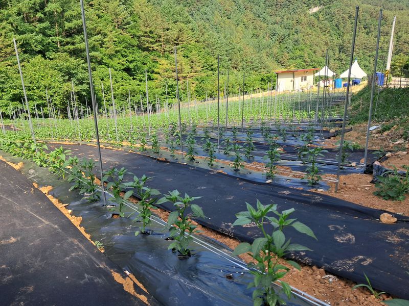 돌이 넘무나 많아 일일이 구멍 뚫었고 고추대 꼽았 고요 이틀 작업 했어요