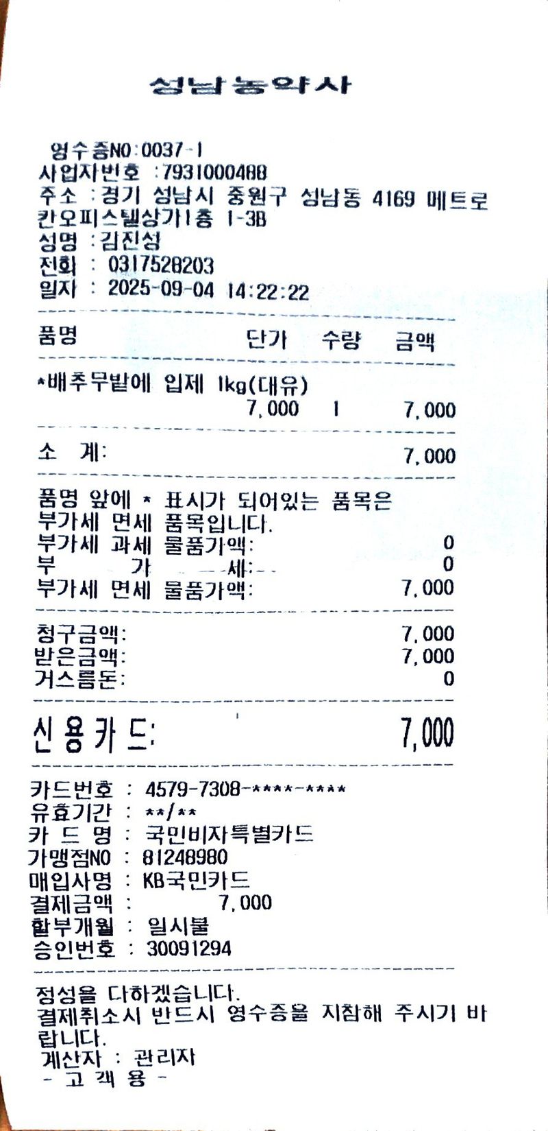 영양제 구입(성남농약사) 배추무밭에 입제 1kg : 7,000원