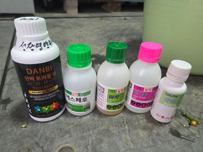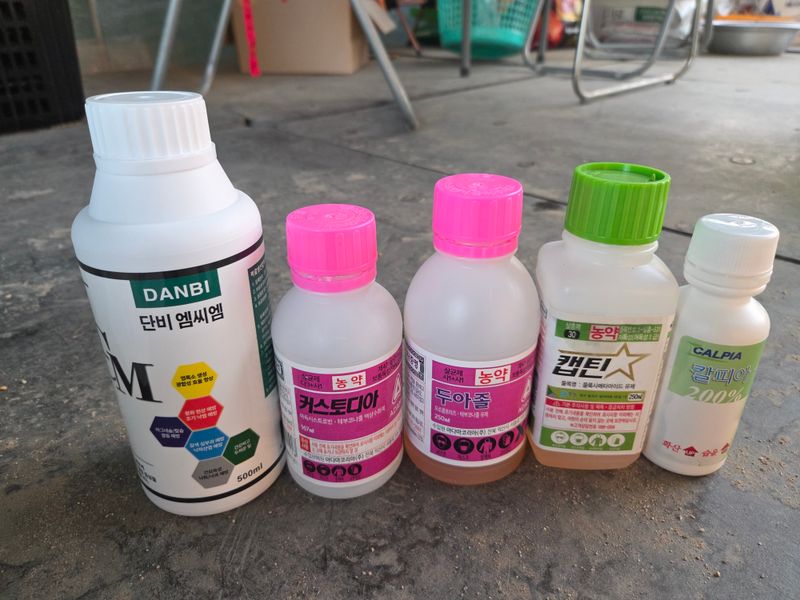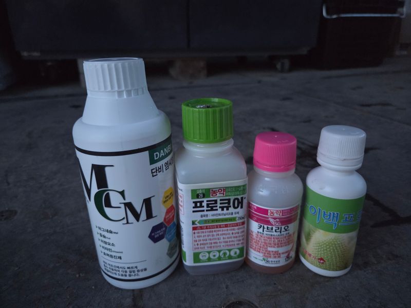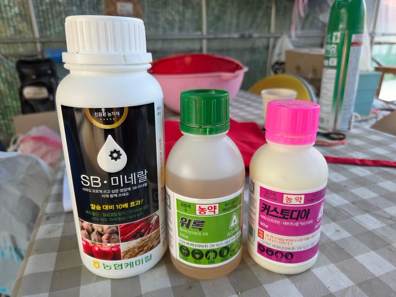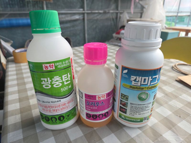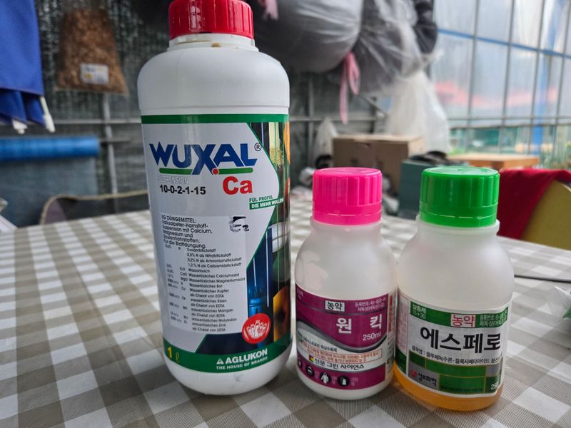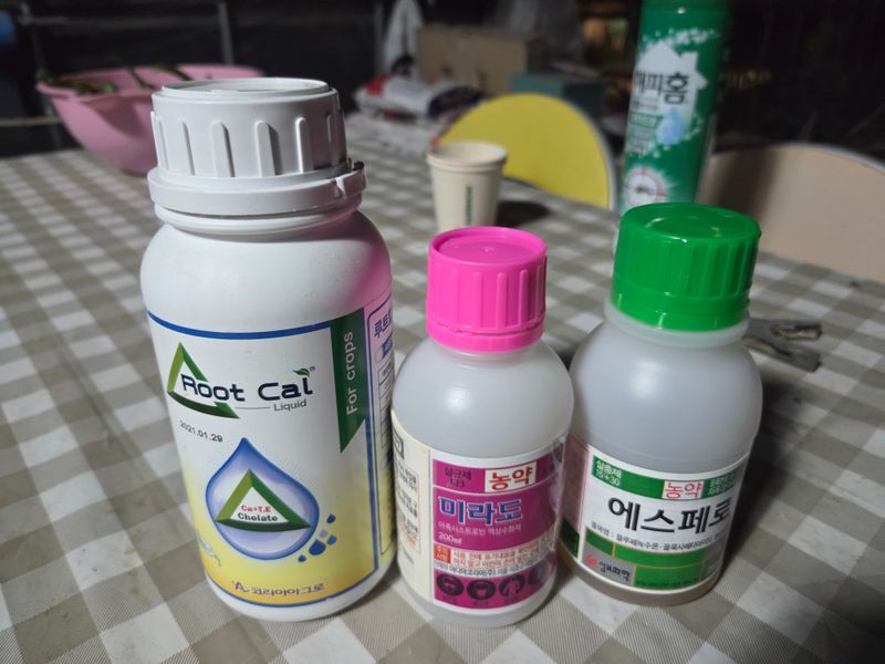 칼슘제 & 어트래커, 돌격대,아미노센, 에스페로, 원킥 혼합 방제 실시. 물주기 3톤 & 아그로솔 1kg 관주