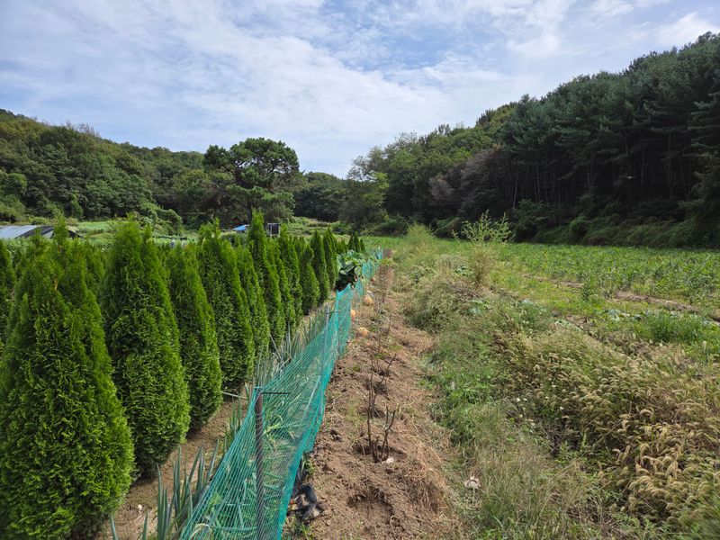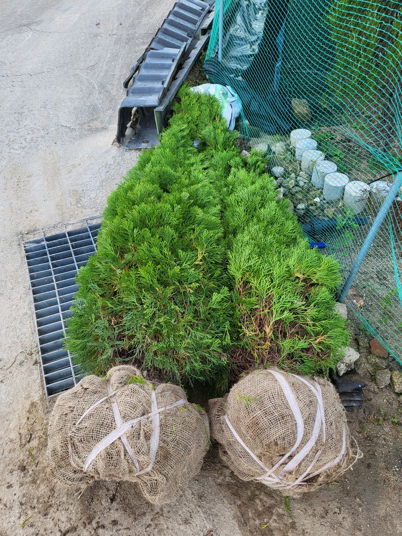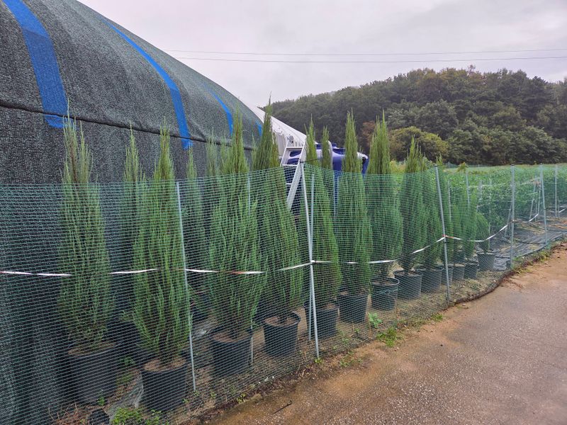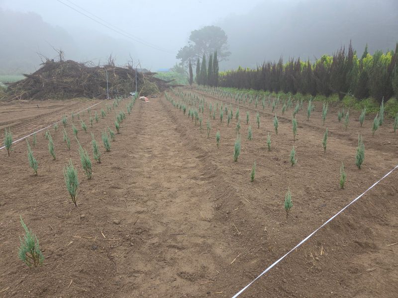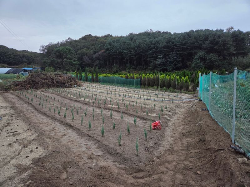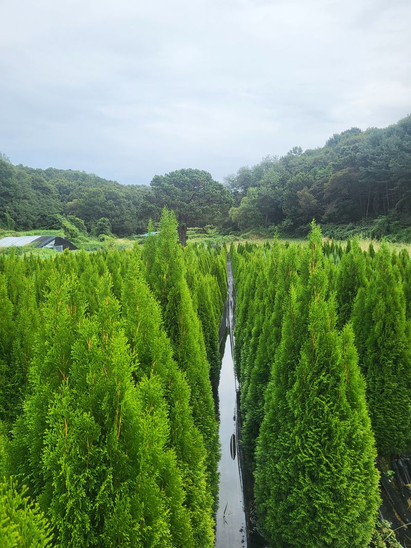 성명 : 장두학 010~7731~1160 21년도 2월부터 조경수, 관상수를 식재해서 지금의 상태가 되었고 식재 내용이 에메랄드그린 1,300주, 써니스마라그 200주, 블루에로우 500주 식재했어요 현재 블루에로우는 1.5미터 이상 이고요, 써니스마라그.에메랄드그린은