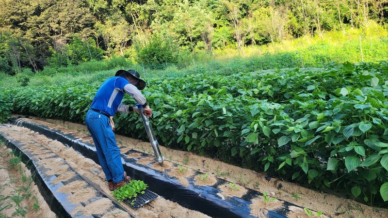 고추밭에 살충제 & 살균제 & 침투제 & 영양제 혼합 엽면시비 물 3톤 미생물 혼합 관주