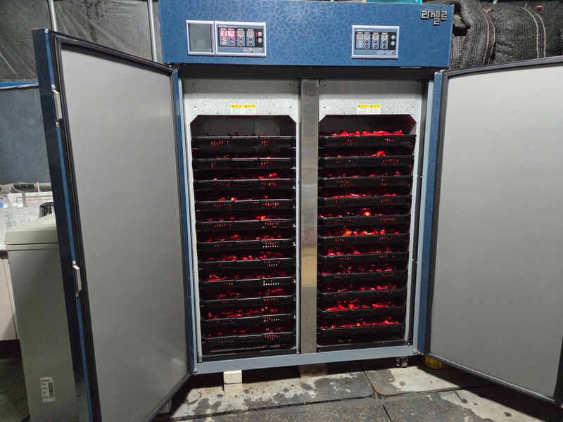 고추 수확 후 세척기에 세척하고 건조기에 물주기 3톤 실시 살충제 & 살균제 & 확산제 & 칼슘영양제 혼합 엽면시비