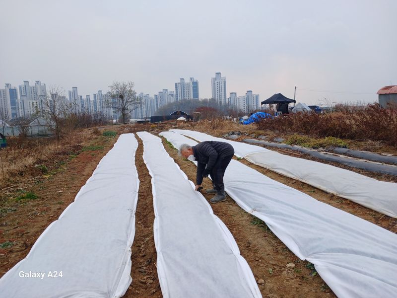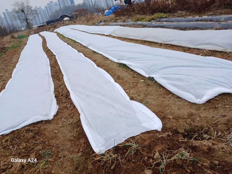 마늘 양파 시금치 봄동 보온 부직포 작업. 했어요