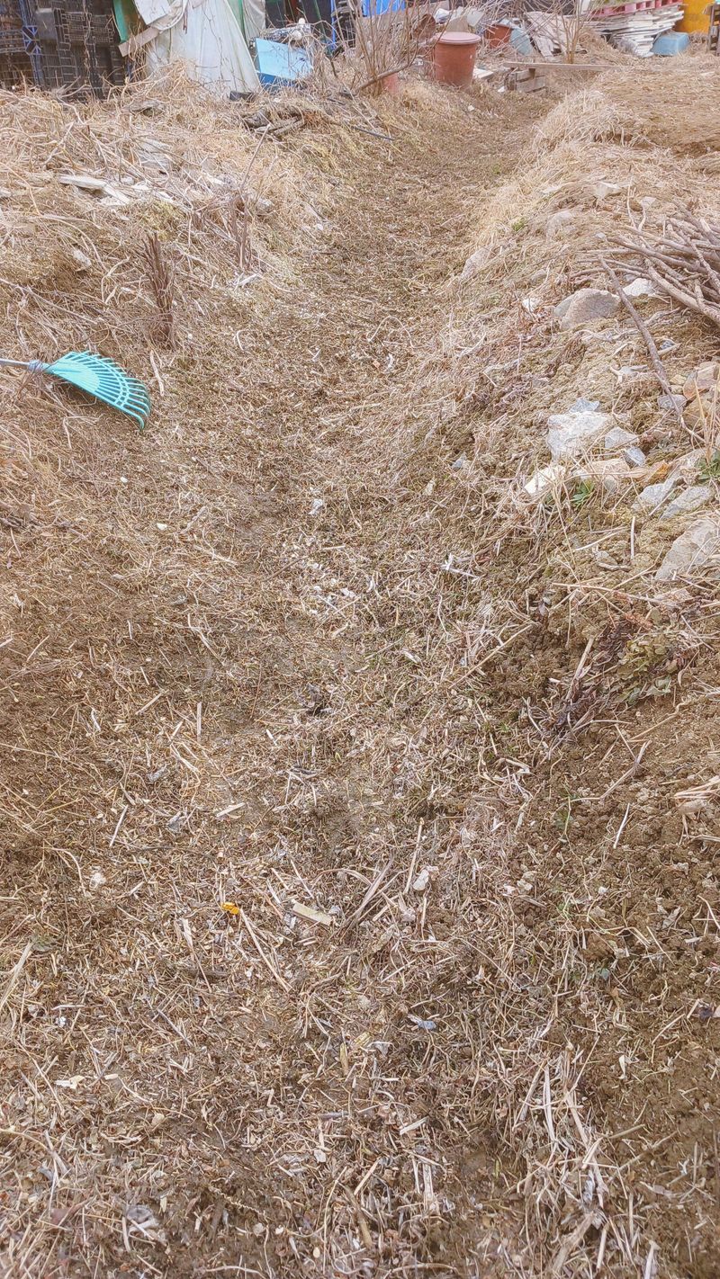 감자 밭 거름주고 두둑만들기. 토양살충제 복합비료 두엄. 뿌리고 손으로 만들어 놓고 감자 씨 준비했어요