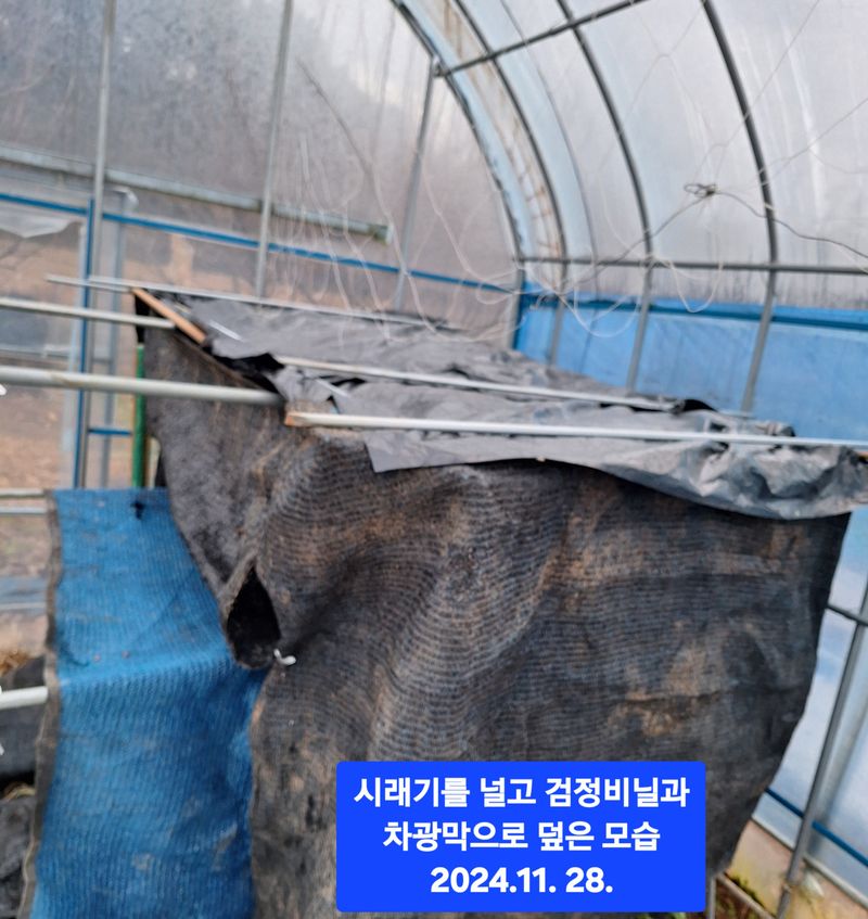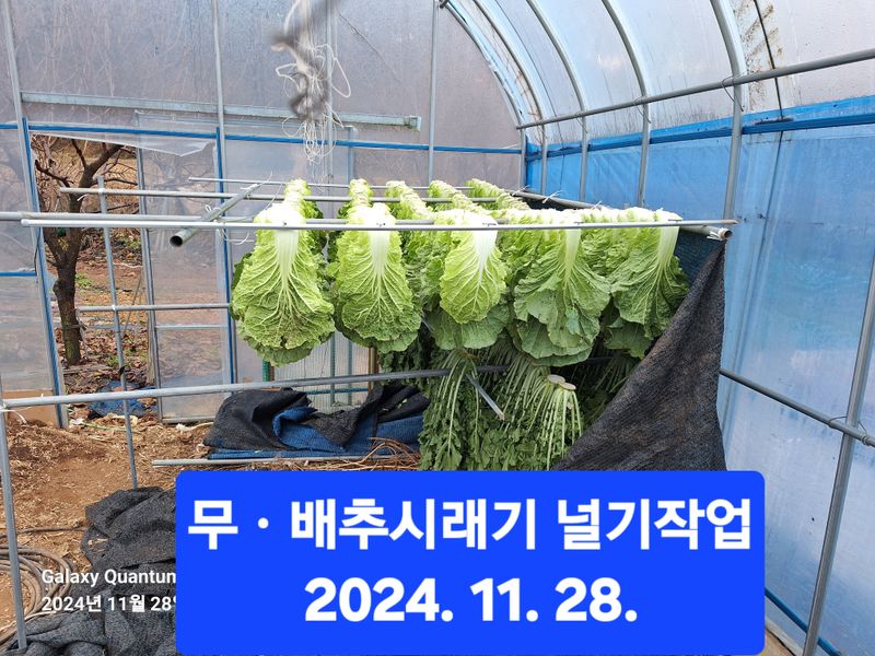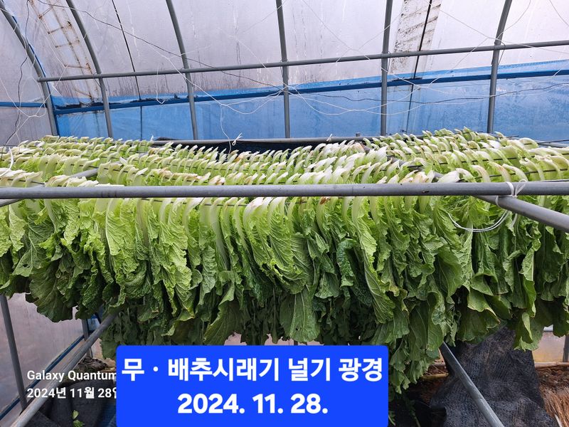 무ㆍ배추 시래기를 세척하여 준비한 거치대에 널기 작업 하였다. 파랗게 건조하려고 차광막과 검정 비닐로 햇빛을 차단하였다.