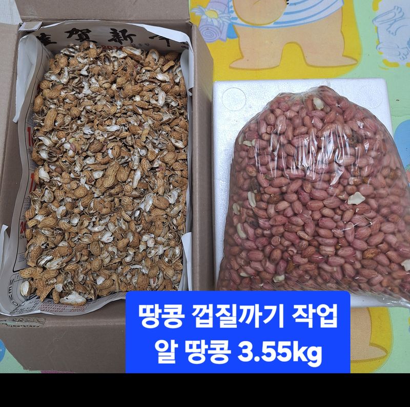 땅콩 껍질까기 작업을 조개망으로 한 망을 하루 종일 혼자서 깠는데 알 땅콩으로 3.55kg이었다.