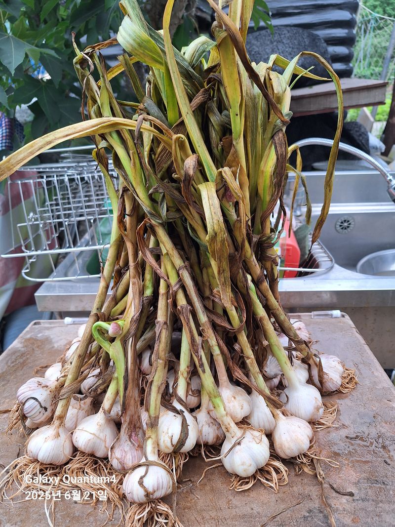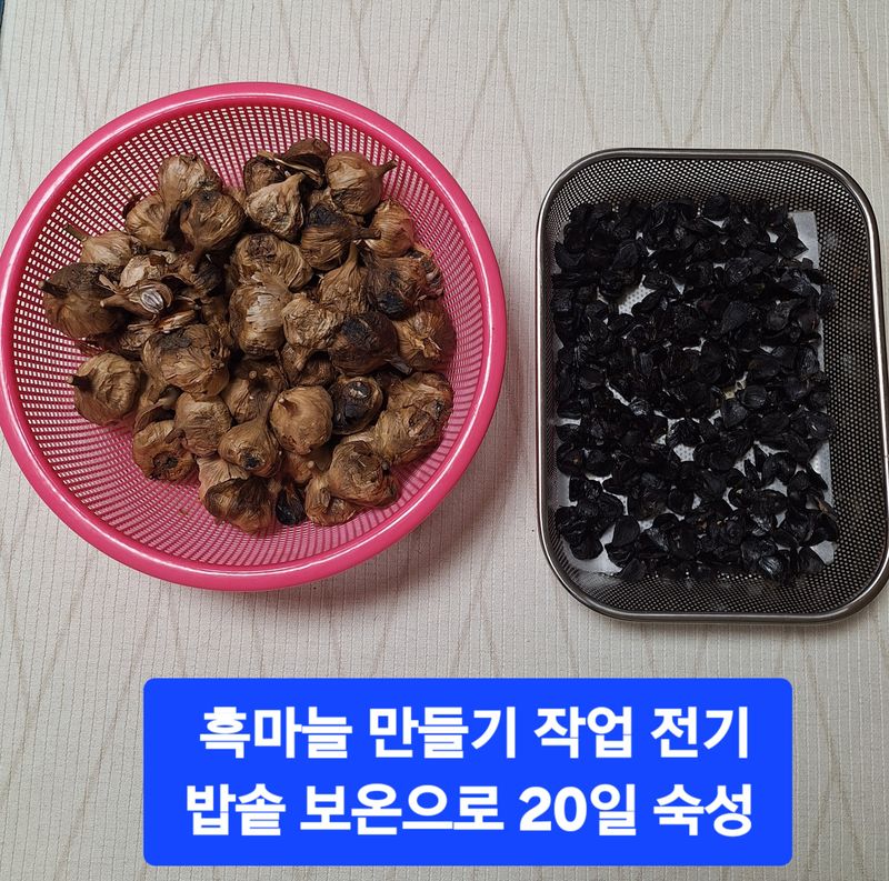 한지형 육쪽마늘 큰 것으로 흑 마늘을 만들기 위하여 전기 보온 밥통에 보온으로 20일간 숙성시켜서 꺼내어 베란다에서 1개월간 자연건조하여 껍질을 벗겼다. 흑 마늘 맛이 아리지도 않고 달착지근 햐여 먹기가 편하다.