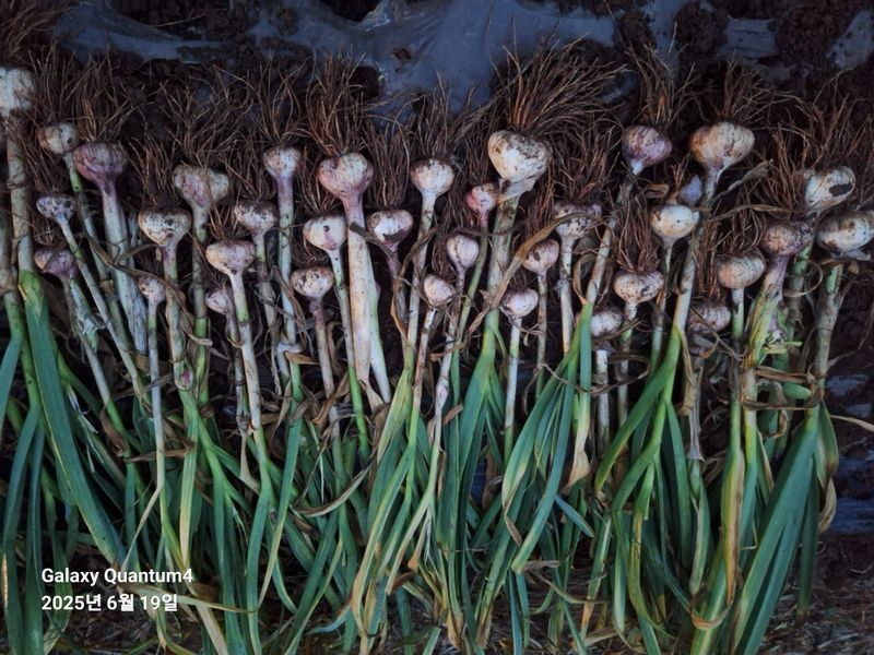 한지형 육쪽마늘을 심었다. 마늘종구는 베노람소독약 및 흑색썩음병 예방살균제 카디스유제ㆍ뿌리응애 살충제 디메토 유제를 희석한 물에 4시간을 침지한 후에 그늘에서 건조한 후에 심었다.